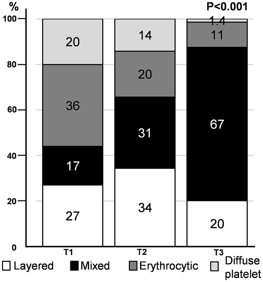 We enrolled patients with thrombi undergoing endovascular therapy (EVT) between July 2017 and July 2023. Thrombus volume on thin-section non-contrast computed tomography was measured using three-dimensional software. Immunohistochemistry analysis included fibrin, red blood cells (RBCs), and platelets. Thrombi were classified based on the overall distribution pattern of the components: layered, erythrocytic, mixed, and diffuse platelet. We analyzed the association between thrombus volume, histopathology, distribution patterns, and clinical/radiologic outcomes.