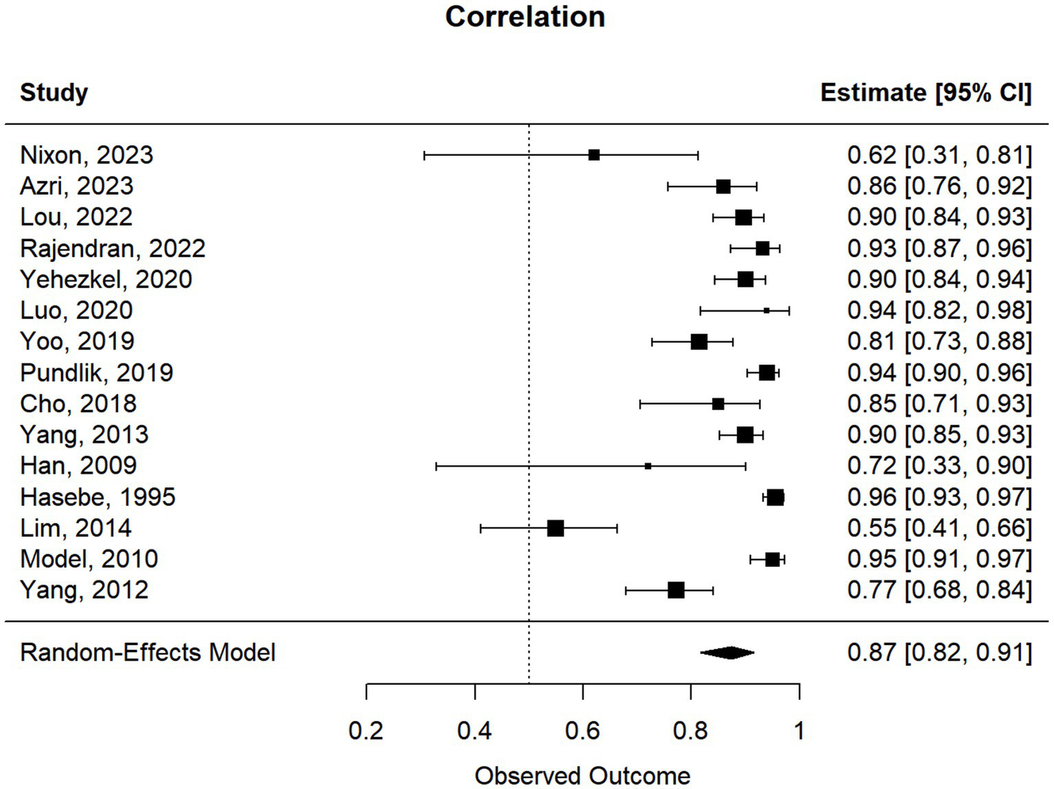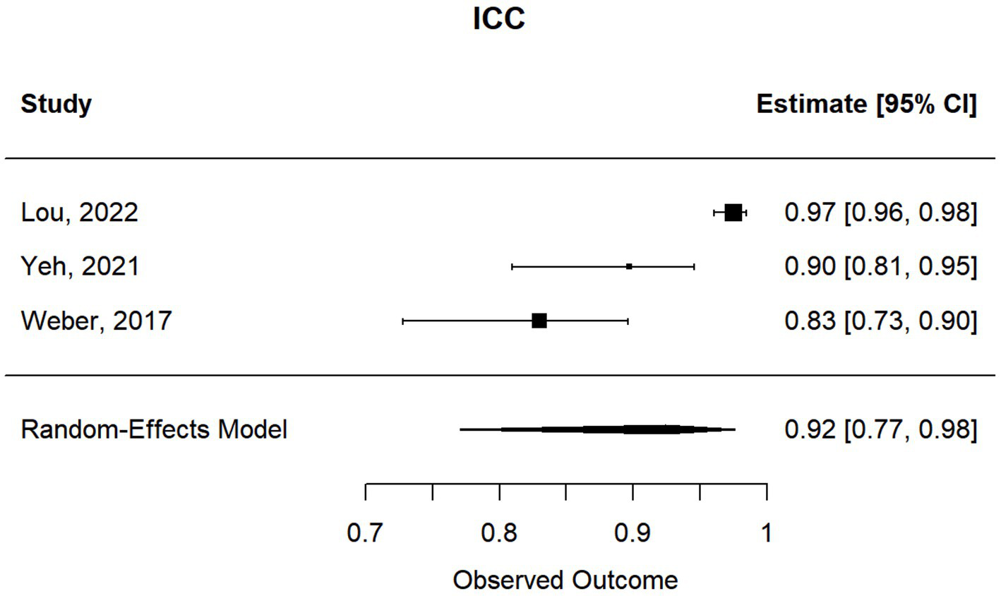 Sixty-nine studies were identified through database search. Of these, 22 studies either examined Pearson correlation, Kendall’s tau correlation, intraclass correlation (ICC), or kappa statistics between the new techniques for strabismus assessment and the gold standard and/or clinical grading scales (Table 1). Because Kendall’s tau correlation coefficient measures a non-linear association between two quantitative continuous variables, we utilized a technique by Gilpin (29) to convert this correlation into Pearson correlation coefficient. For data characterized by non-continuous variables, Kappa coefficient and ICC were often reported, but they are not on the same scale even though they provide a measure of agreement between two techniques or two raters. In addition, Kappa deals with nominal data while ICC provides a more effective analysis of ordinal and interval data. Nominal data is used to label variables without any quantitative value. It categorizes data by labeling or naming values. The key characteristics of nominal data are: (1) no inherent order- the categories are distinct and separate, with no hierarchy or ranking among them, (2) data consists of mutually exclusive categories- each category is unique, and an item can belong to only one category, (3) uses descriptive names or terms to represent categories, without implying any numerical relationships. Ordinal data is a type of data that classifies variables into categories with a meaningful order or ranking. The key characteristics of ordinal data are: (1) data categories are ranked, having a clear order or hierarchy, such as from high to low, (2) the intervals between categories are not necessarily equal and numerical values can be used as labels, but these values do not represent equal intervals. We therefore reported their results separately from those of Pearson correlation and Kendall’s tau. To obtain a more accurate approximation of confidence intervals around the estimates, all correlations and ICC were transformed using the Fisher’s Z transformation (30):