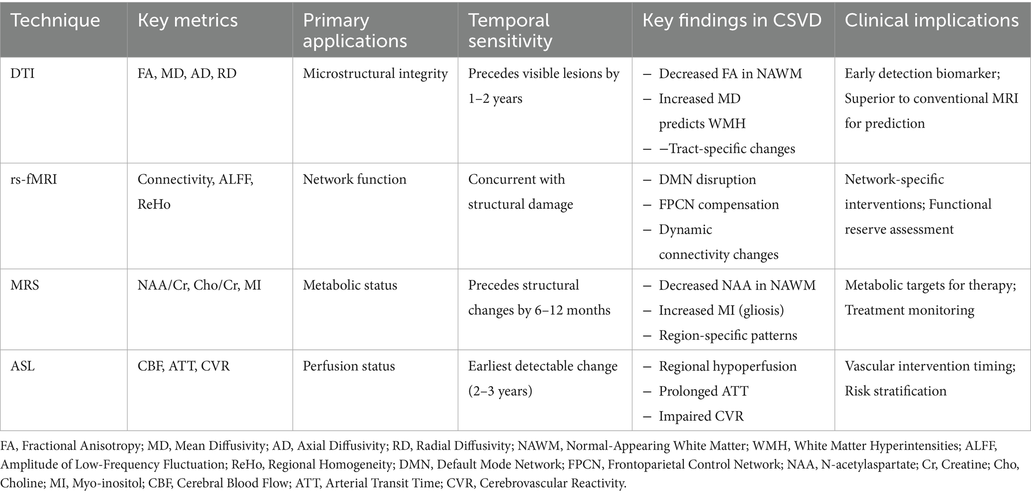 Figure 4. Functional MRI Techniques in CSVD Assessment. Illustration of the four main functional MRI techniques used in CSVD assessment. Diffusion Tensor Imaging (DTI): Tracks water diffusion along white matter tracts to assess microstructural integrity, with key metrics including fractional anisotropy (FA) and mean diffusivity (MD). Resting-State fMRI (rs-fMRI): Measures spontaneous neural activity and functional connectivity between brain regions, identifying network disruption patterns. Magnetic Resonance Spectroscopy (MRS): Quantifies brain metabolites such as N-acetylaspartate (NAA), creatine (Cr), choline (Cho), and myo-inositol (mI) to detect neuronal integrity and membrane turnover. Arterial Spin Labeling (ASL): Non-invasively measures cerebral blood flow and arterial transit time, often revealing the earliest detectable changes in CSVD.
