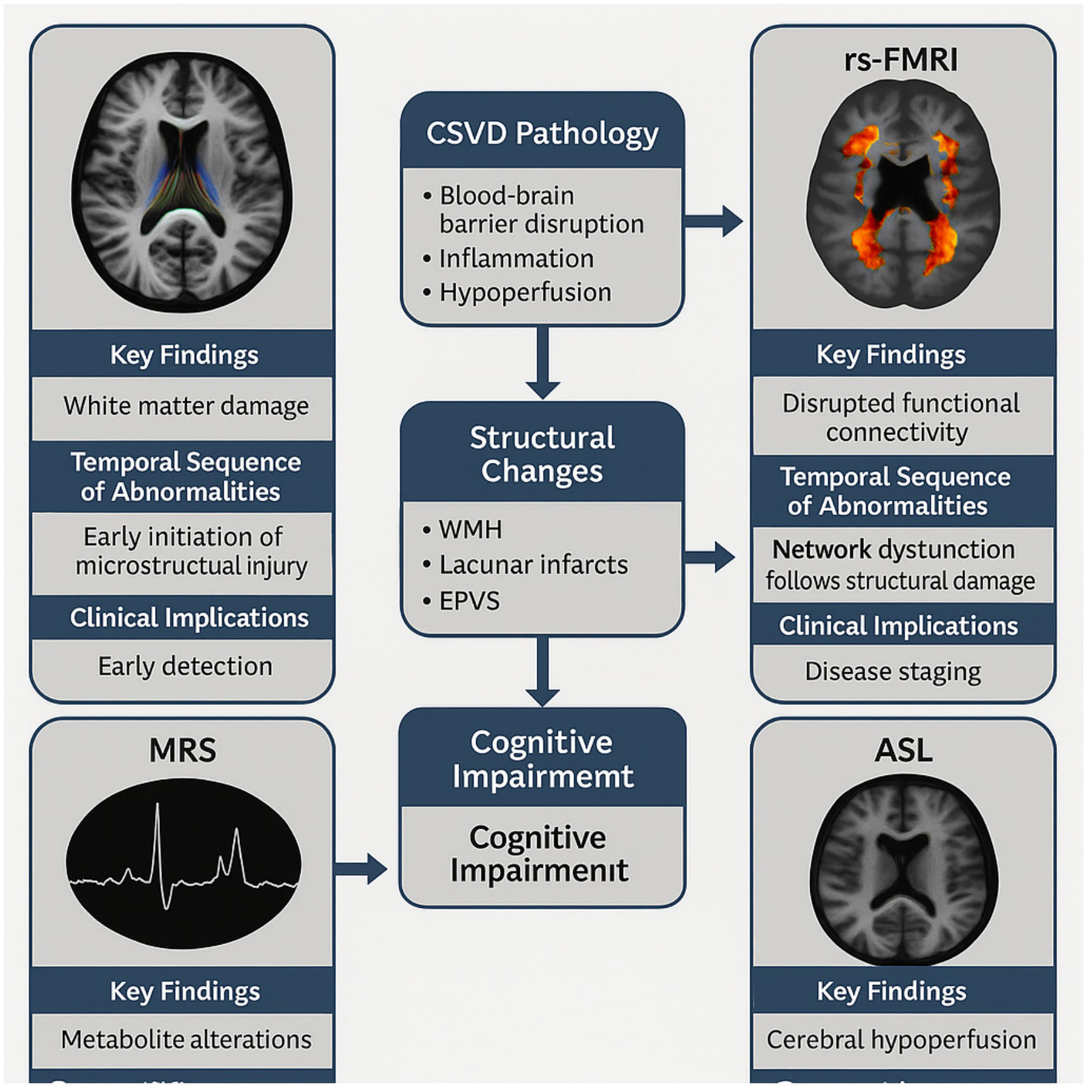 Multimodal Functional MRI Framework in CSVD-Related Cognitive Dysfunction. This graphical abstract illustrates the comprehensive framework of functional MRI applications in CSVD. The central panel shows the progression from CSVD pathology (involving blood–brain barrier disruption, inflammation, and hypoperfusion) to structural changes (WMH, CMBs, lacunar infarcts, EPVS), leading to network dysfunction and ultimately cognitive impairment. The surrounding panels depict the four functional MRI techniques (DTI, rs-fMRI, MRS, and ASL) with their key findings, temporal sequence of abnormalities, and clinical implications. The integration of these techniques enables early detection, disease staging, and personalized interventions.