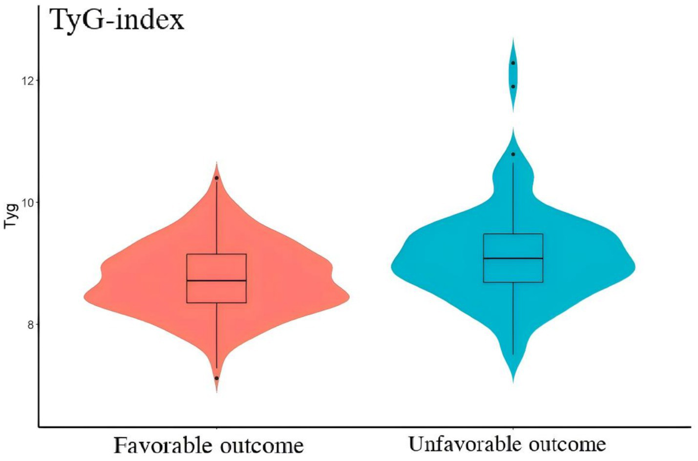 The comparison of TyG-i between good outcome group and unfavorable outcome group. Compared with good outcome group, unfavorable outcome group had a significant higher level of TyG-i (8.72 (8.35–9.15) vs. 9.08 (8.70, 9.48), p < 0.001).