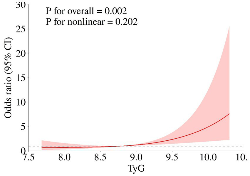 Previous researches has identified that peripheral blood markers such as hemoglobin, white blood cell, and various inflammation markers, that are associated with the prognosis of aSAH patients (3–6). The triglyceride-glucose index (TyG-i), calculated from peripheral blood glucose and triglyceride, has been recognized as a valuable predictive tool for the prognosis of cardiovascular disease (7–9). Recently, Huang et al. discovered that TyG-i is significantly correlated with all-cause mortality in hemorrhagic stroke patients (10). However, few studies have examined the association between TyG-i and clinical outcome of aSAH patients. This investigation aims to explore the potential correlation between TyG-i and the prognosis of aSAH patients.