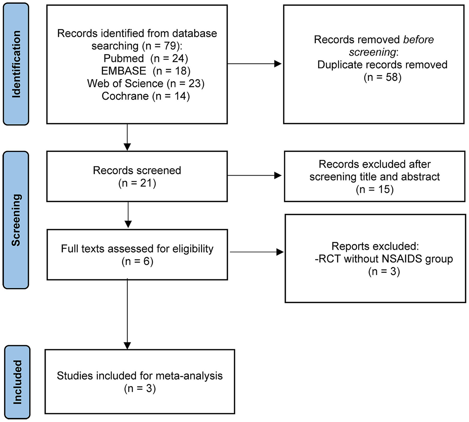 Following searches on PubMed, EMBASE, the Cochrane Library, and Web of Science by two independent researchers using predefined search terms, a total of 79 articles available until March 10, 2025 were retrieved. After removing 58 duplicates, the remaining 21 articles underwent screening of titles and abstracts, leading to the exclusion of 15 articles. Subsequently, the full texts and references of the remaining 6 articles were screened, resulting in the exclusion of 3 RCTs (41–43) based on the selection criteria. Ultimately, 3 studies (44–46) were included in this meta-analysis (Figure 2). The detailed characteristics of the enrolled studies and patients are presented in Tables 1, 2.