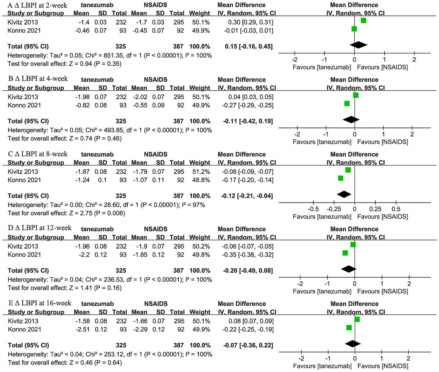 Meta-analysis of 5 mg tanezumab versus NSAIDs in Δ LBPI scores at (A) 2-week, (B) 4-week, (C) 8-week, (D) 12-week, and (E) 16-week follow-ups.