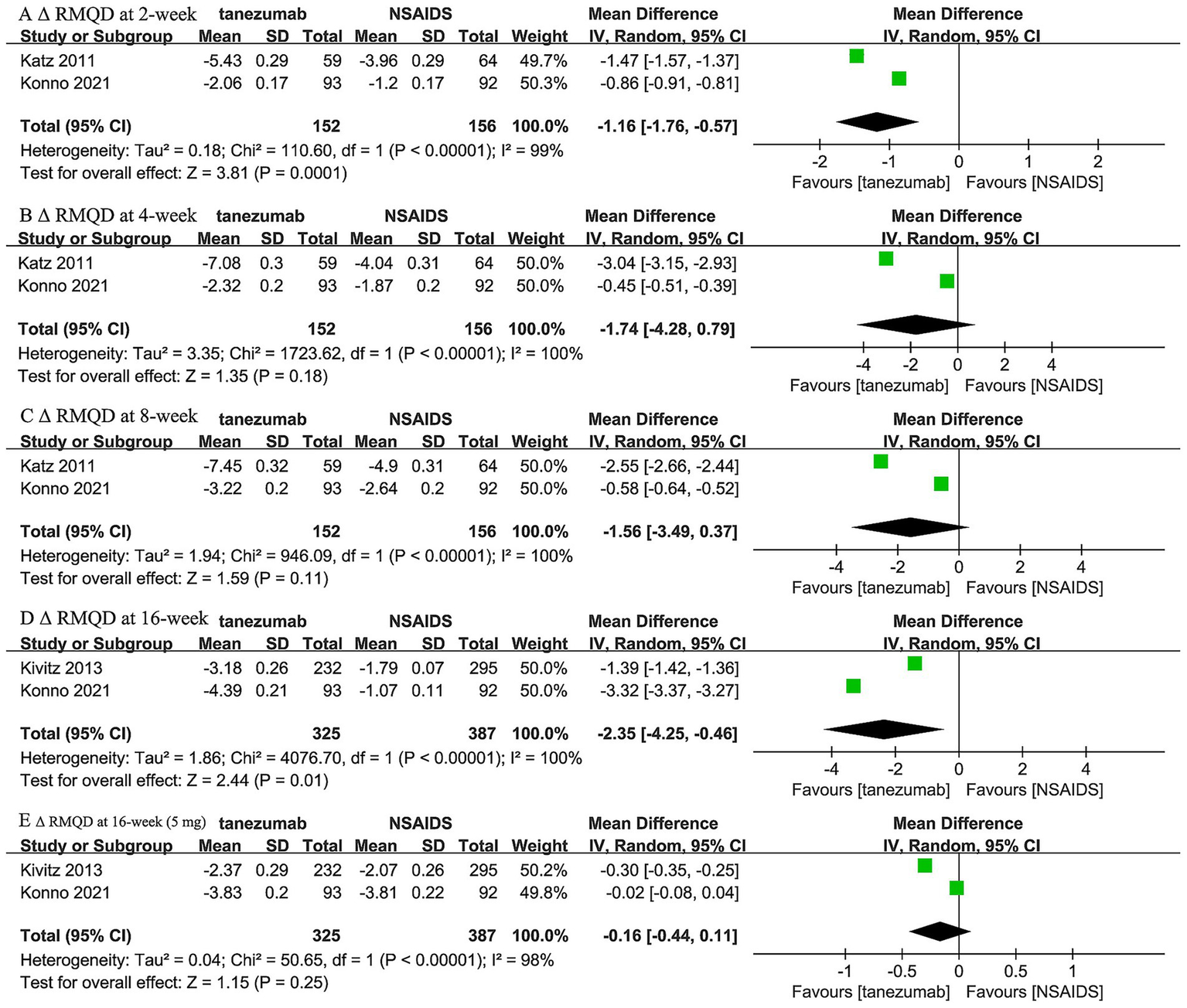 Meta-analysis of 10 mg tanezumab versus NSAIDs in Δ RMDQ scores at (A) 2-week, (B) 4-week, (C) 8-week, (D) 16-week; 5 mg tanezumab versus NSAIDs in Δ RMDQ scores at (E) 16-week.