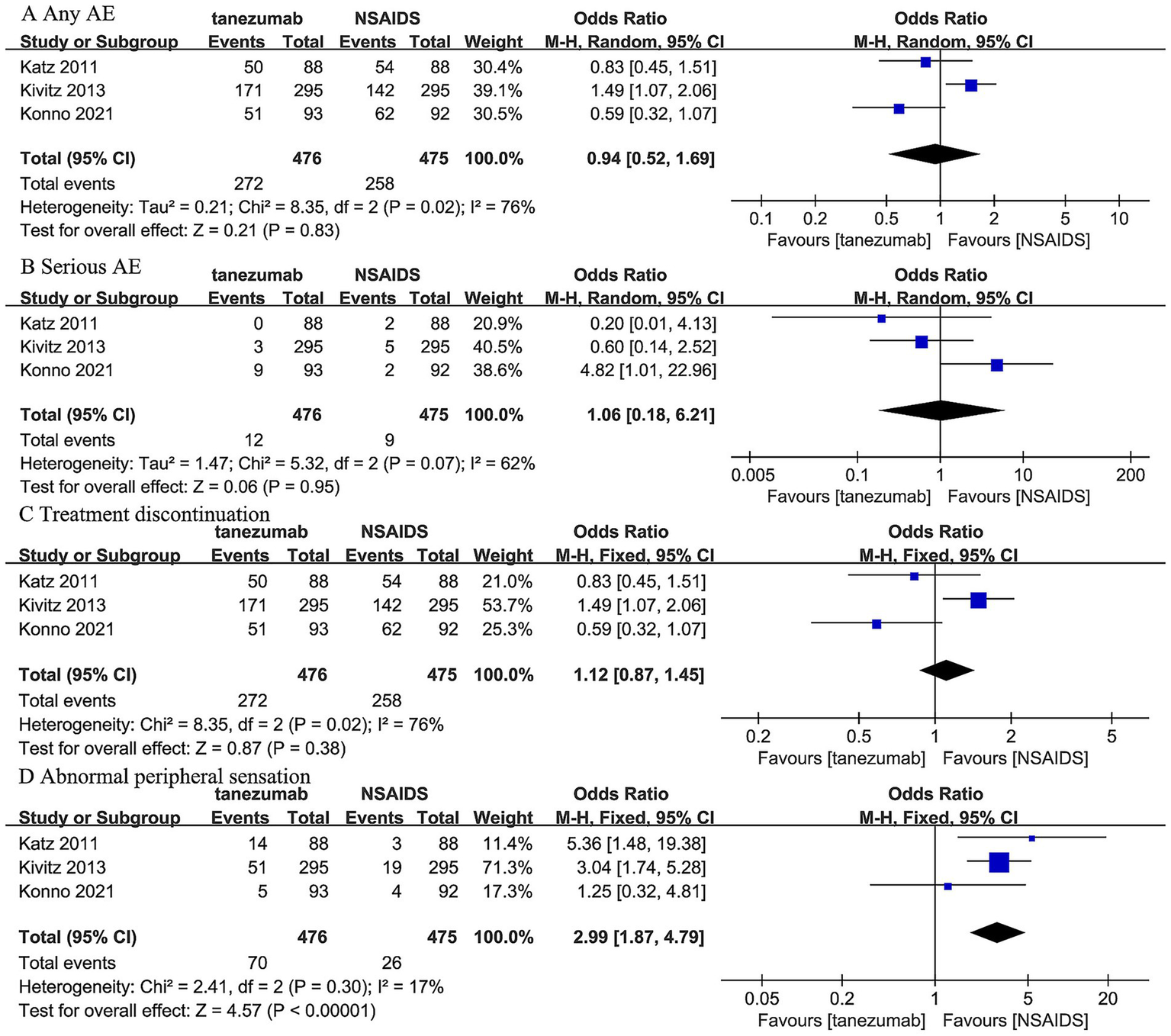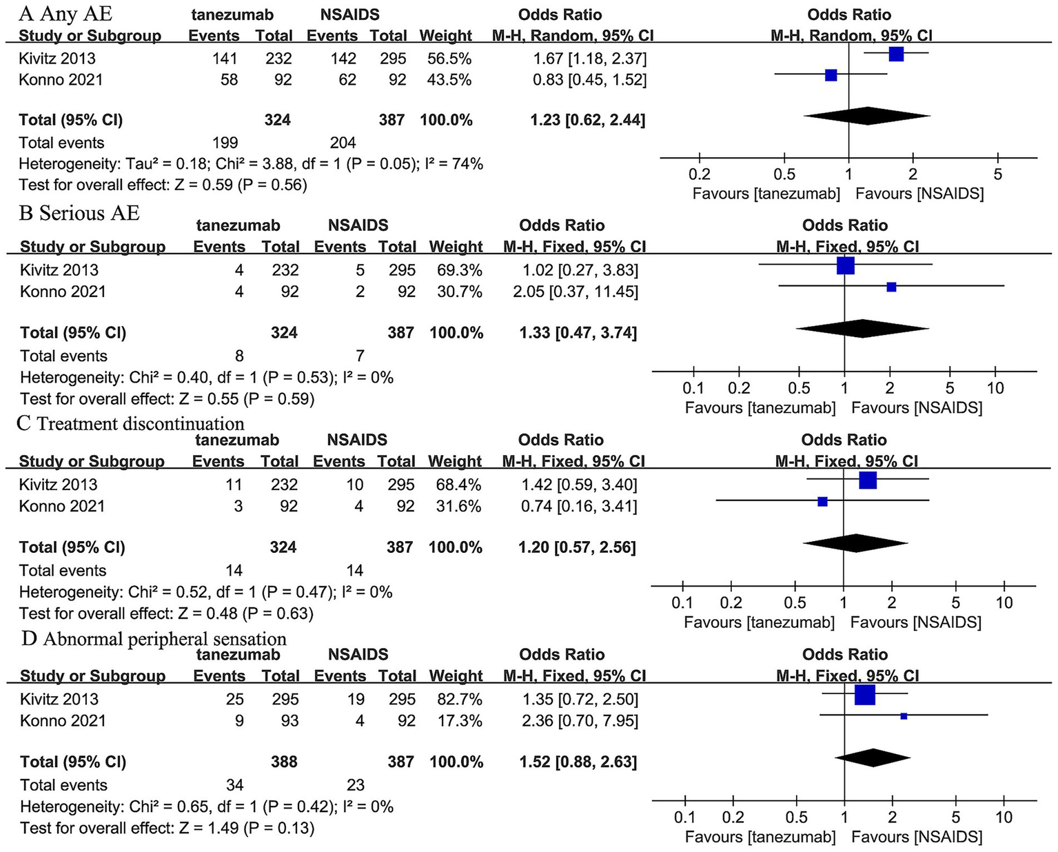 Meta-analysis of 5 mg tanezumab versus NSAIDs in (A) any AE, (B) serious AE, (C) treatment discontinuation due to AE, (D) abnormal peripheral sensation.