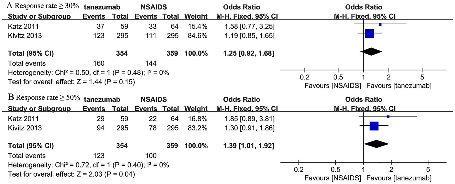 Individual study provided further detail on specific safety concerns regarding joint safety. The Katz et al. (46) trial and Kivitz et al. (45) trial reported no joint safety event. However, the Konno et al. (44) trial, featuring an 80-week follow-up, observed rare but significant joint safety events. This included one patient in the 5 mg tanezumab group with RPOA type 1 in both knees, and two patients in the 10 mg tanezumab group with a subchondral insufficiency fracture of the left knee and RPOA type 2 of the left hip, respectively. The RPOA type 2 case notably led to the only total joint replacement reported across these three included studies. These specific RPOA events were identified in peripheral joints (knees and hips) with pre-existing possible-to-mild (Kellgren–Lawrence grade 1–2) radiographic evidence of OA at screening. However, similar joint destruction progression in the lumbar spine was not reported in these included trials.