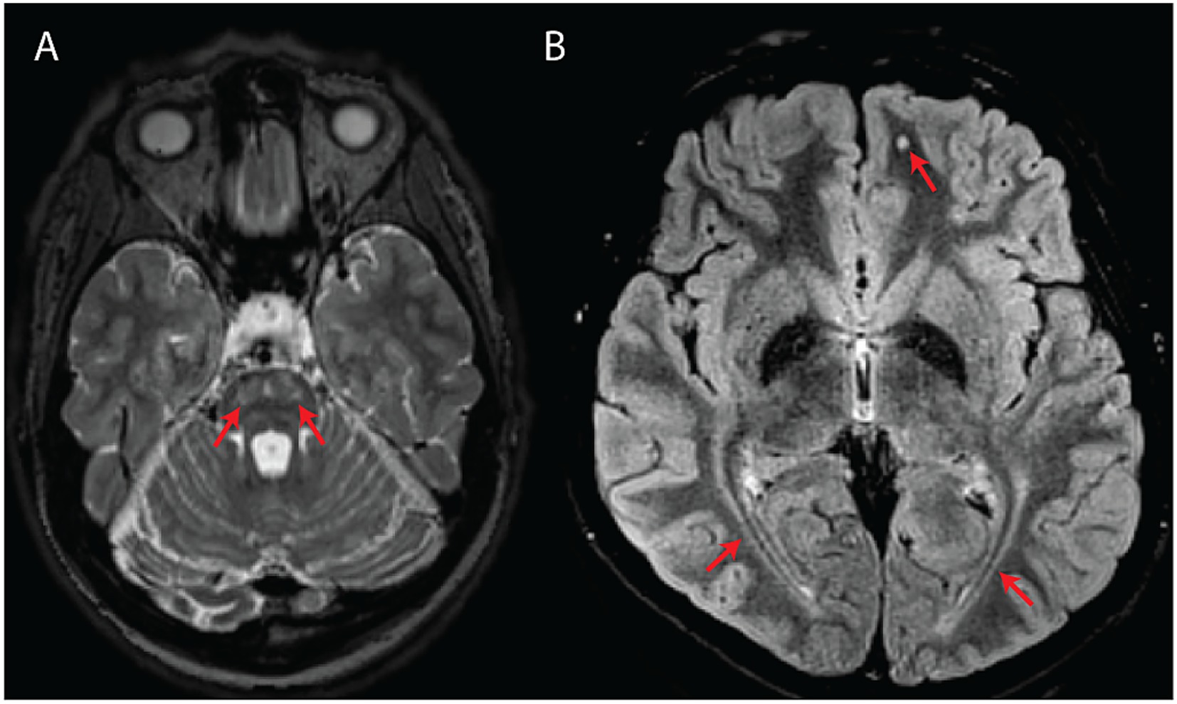 Figure 1. Classical MRI features associated with WFS. (A) Axial T2-weighted image showing bilateral pontine signal abnormality (subject #10). (B) Axial T2-FLAIR image showing bilateral symmetric posterior white matter abnormal signal as well as a punctate, round white matter signal abnormality in the left frontal lobe (subject #14).