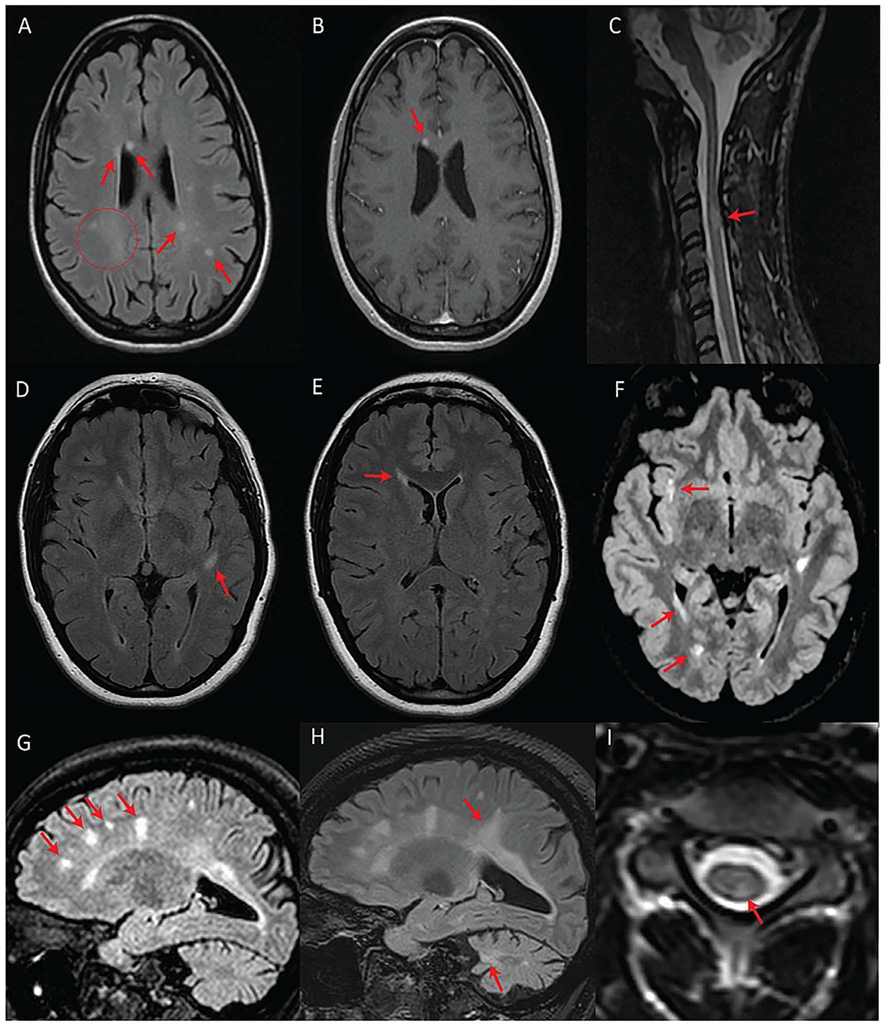 Figure 2. Patients with fulfilled or partially fulfilled McDonald criteria. (A–C) Represent subject #2 (criteria fulfilled). (A) Axial T2-FLAIR image showing multifocal periventricular, callosal, and subcortical white matter lesions (arrows) with accompanying diffuse abnormal peritrigonal white matter signal (circle). (B) Post-gadolinium axial T1 image showing an enhancing callosal lesion. (C) Sagittal T2 image of the cervical and thoracic spinal cord showing a demyelinating lesion at the level of C3. (D–F) Represent subject #1 (criteria partially fulfilled). (D) Axial T2-FLAIR showing an oval-shaped lesion in the left temporal subcortical white matter. (E) Axial T2-FLAIR showing a periventricular lesion around the frontal horn of the right lateral ventricle. (F) Axial T2-FLAIR, performed 7 years after the first exam (D,E), showing new focal white matter lesions in the right insula, right periventricular white matter, and along the posterior horn of the right lateral ventricle. (G–I) Represent subject #3 (criteria fulfilled). (G) Sagittal T2-FLAIR showing multifocal white matter lesions perpendicular to the ventricular walls. (H) Sagittal T2-FLAIR, performed 4 years after initial MRI (G), demonstrating progression of the lesion burden in both the supra and infratentorial regions despite treatment with teriflunomide as of the first year in the 4-year interval. (I) Axial T2 spinal cord MRI showing a white matter lesion located in the left posterior cord at the C3 level.