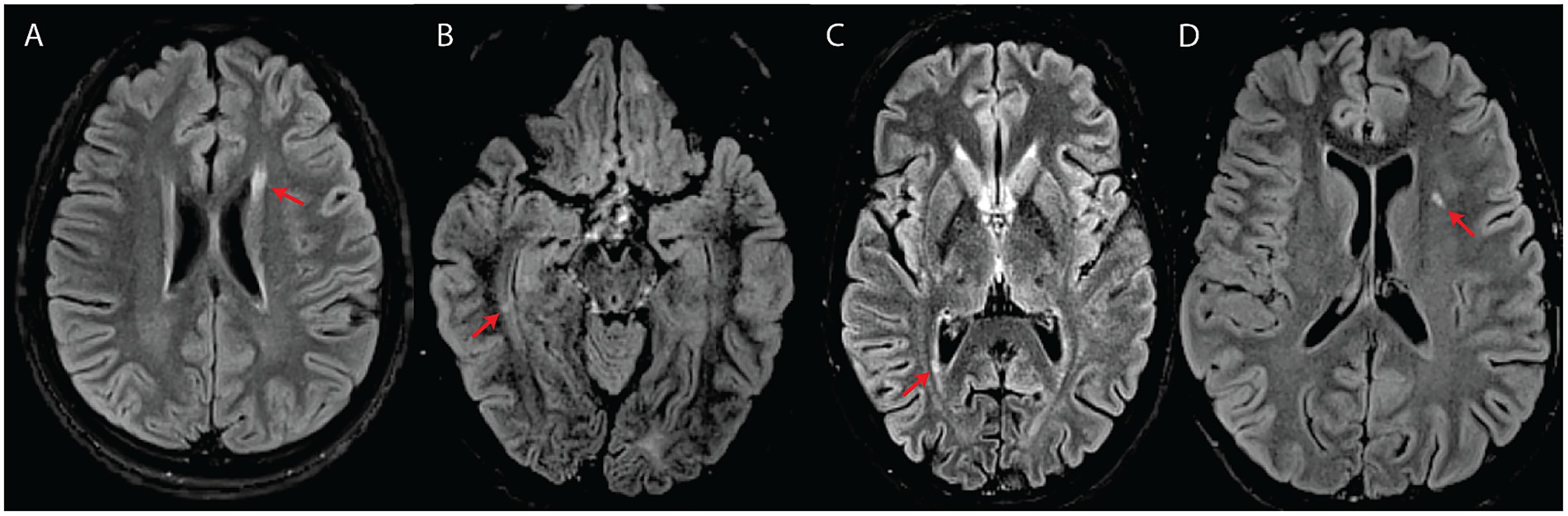 Figure 3. White matter abnormalities suggestive of an inflammatory process (A–C) or classified as intermediate (D) in four subjects with WFS. All images are axial T2-FLAIR. (A) Elongated lesion located at the level of the anterior horn of the left lateral ventricle (subject #7). (B) Small temporal periventricular lesion perpendicular to the right ventricular wall (subject #7). (C) Small periventricular lesion perpendicular to the right ventricular wall (subject #10). (D) Left insular deep white matter lesion classified as intermediate between suspicious for inflammatory process and typical for WFS (subject #8).