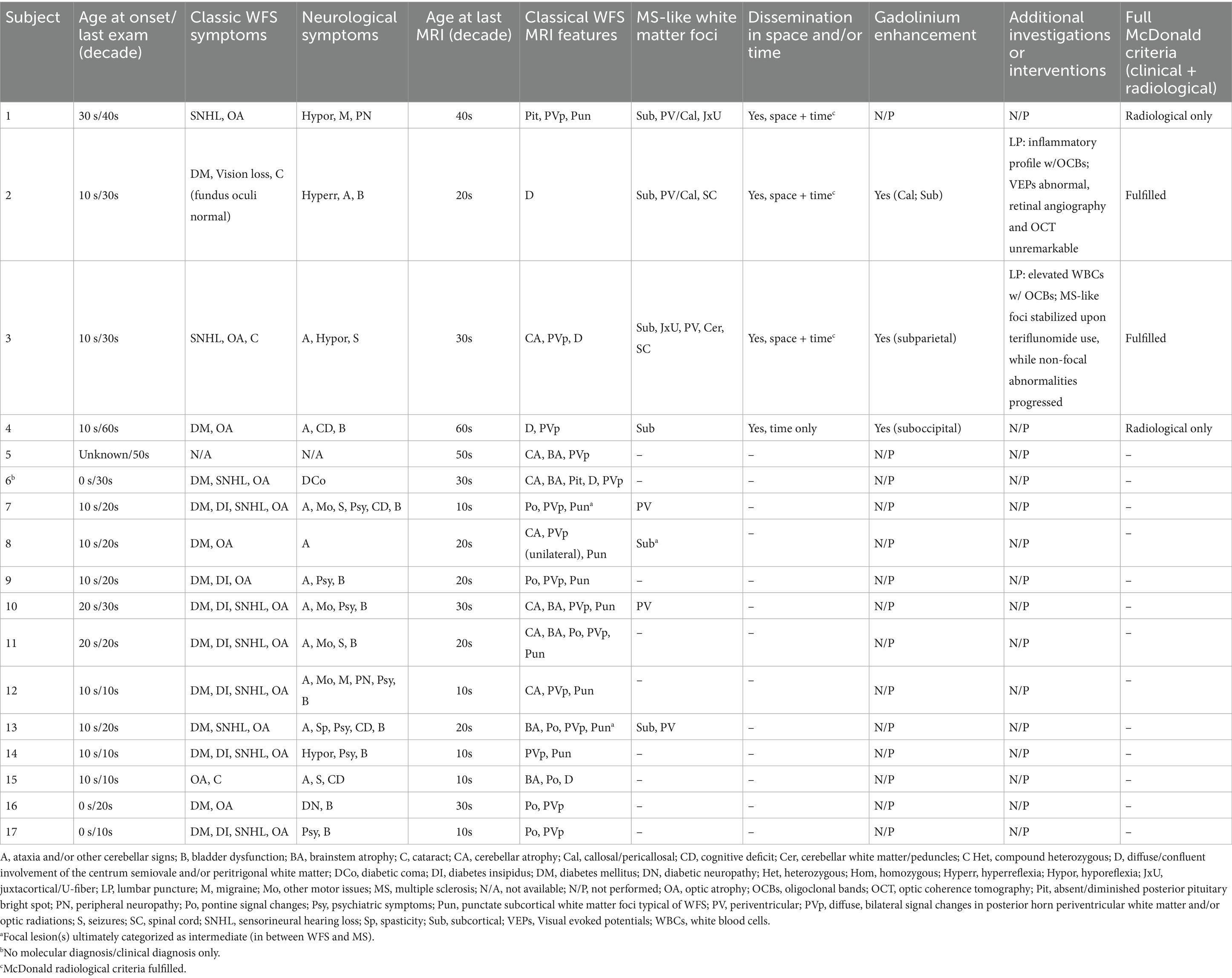 Results: Seven subjects (7/17; 41%) showed at least one focal white matter lesion evocative of MS. Among these seven, three fulfilled the McDonald radiological criteria of dissemination in space and time, suggesting an inflammatory demyelinating process. All subjects reviewed in the study had at least one of the classical WFS MRI features.