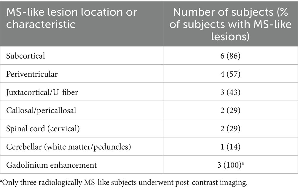 Table 2. Distribution of MS plaque-like foci across the seven subjects in which these were identified.