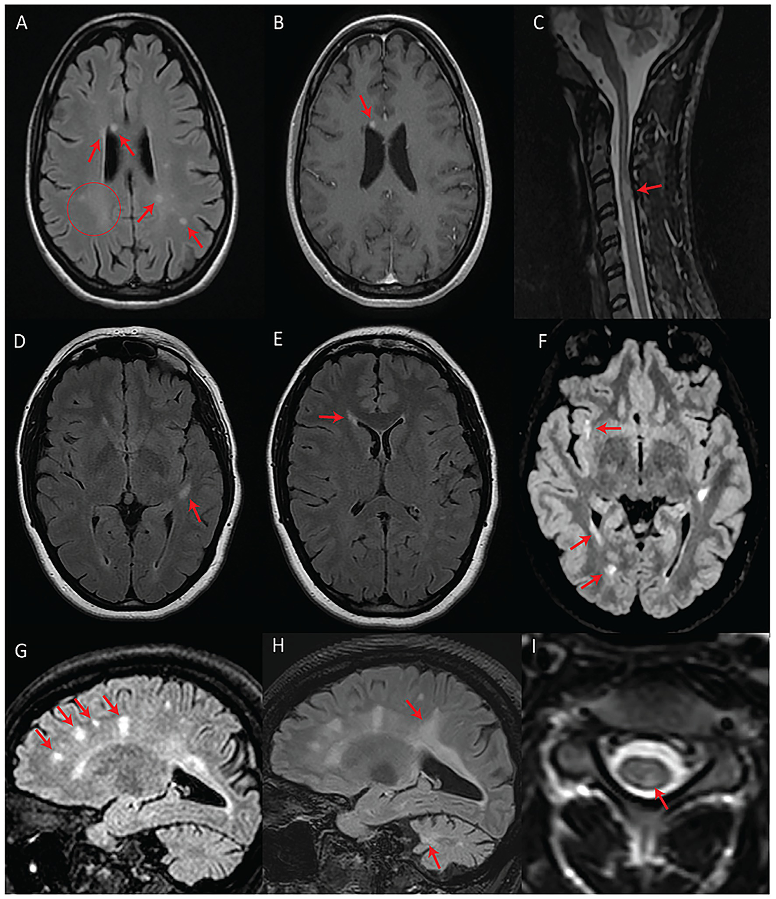 Patients with fulfilled or partially fulfilled McDonald criteria. (A–C) Represent subject #2 (criteria fulfilled). (A) Axial T2-FLAIR image showing multifocal periventricular, callosal, and subcortical white matter lesions (arrows) with accompanying diffuse abnormal peritrigonal white matter signal (circle). (B) Post-gadolinium axial T1 image showing an enhancing callosal lesion. (C) Sagittal T2 image of the cervical and thoracic spinal cord showing a demyelinating lesion at the level of C3. (D–F) Represent subject #1 (criteria partially fulfilled). (D) Axial T2-FLAIR showing an oval-shaped lesion in the left temporal subcortical white matter. (E) Axial T2-FLAIR showing a periventricular lesion around the frontal horn of the right lateral ventricle. (F) Axial T2-FLAIR, performed 7 years after the first exam (D,E), showing new focal white matter lesions in the right insula, right periventricular white matter, and along the posterior horn of the right lateral ventricle. (G–I) Represent subject #3 (criteria fulfilled). (G) Sagittal T2-FLAIR showing multifocal white matter lesions perpendicular to the ventricular walls. (H) Sagittal T2-FLAIR, performed 4 years after initial MRI (G), demonstrating progression of the lesion burden in both the supra and infratentorial regions despite treatment with teriflunomide as of the first year in the 4-year interval. (I) Axial T2 spinal cord MRI showing a white matter lesion located in the left posterior cord at the C3 level.