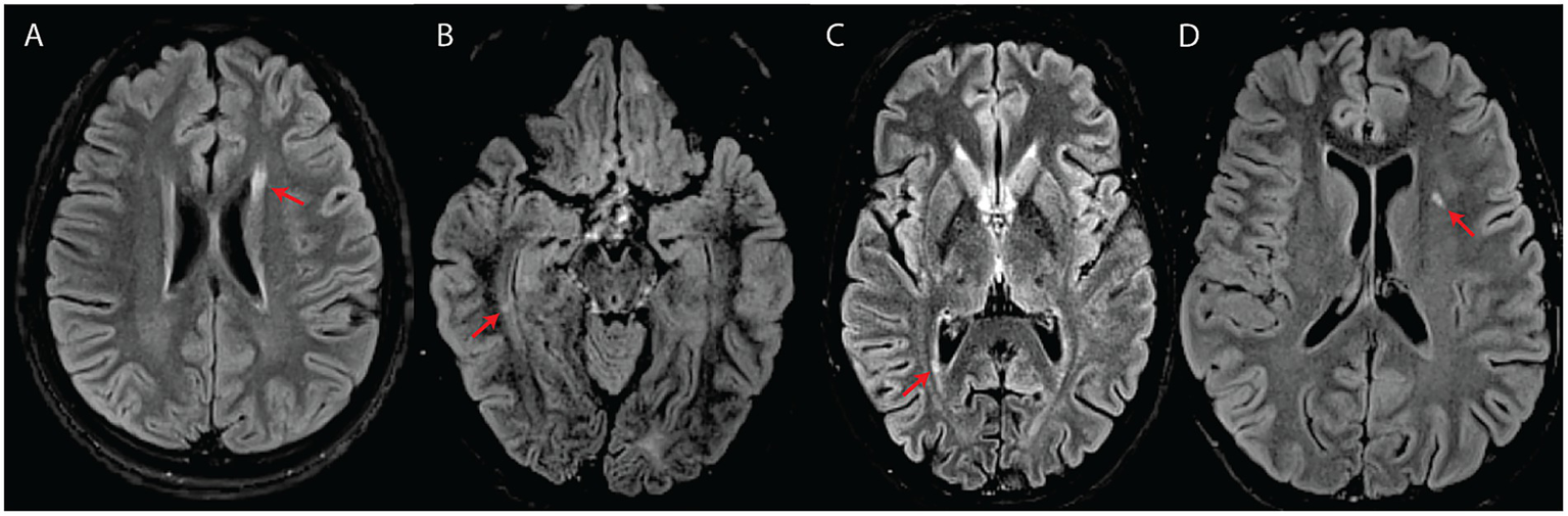 White matter abnormalities suggestive of an inflammatory process (A–C) or classified as intermediate (D) in four subjects with WFS. All images are axial T2-FLAIR. (A) Elongated lesion located at the level of the anterior horn of the left lateral ventricle (subject #7). (B) Small temporal periventricular lesion perpendicular to the right ventricular wall (subject #7). (C) Small periventricular lesion perpendicular to the right ventricular wall (subject #10). (D) Left insular deep white matter lesion classified as intermediate between suspicious for inflammatory process and typical for WFS (subject #8).