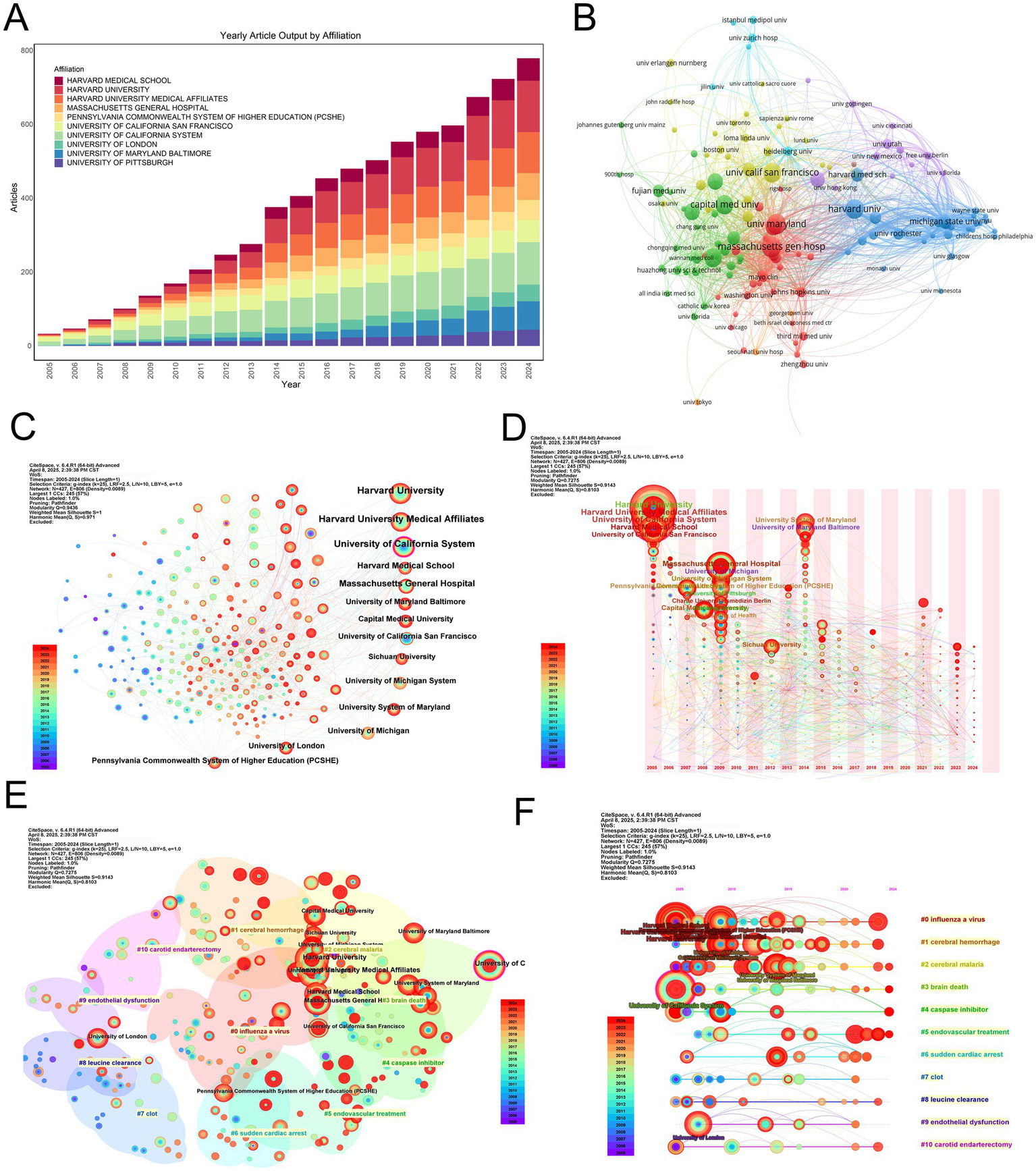 Thematic mapping of institutional outputs revealed distinct research profiles (Figure 4F). Harvard-affiliated centers demonstrated broad expertise across pathophysiology and clinical outcomes, contrasting with the focus of the University of California System on experimental therapies and neuroinflammation. European institutions, including the Humboldt University of Berlin, occupied specialized niches in preclinical modeling, emphasizing geographic variations in research prioritization.