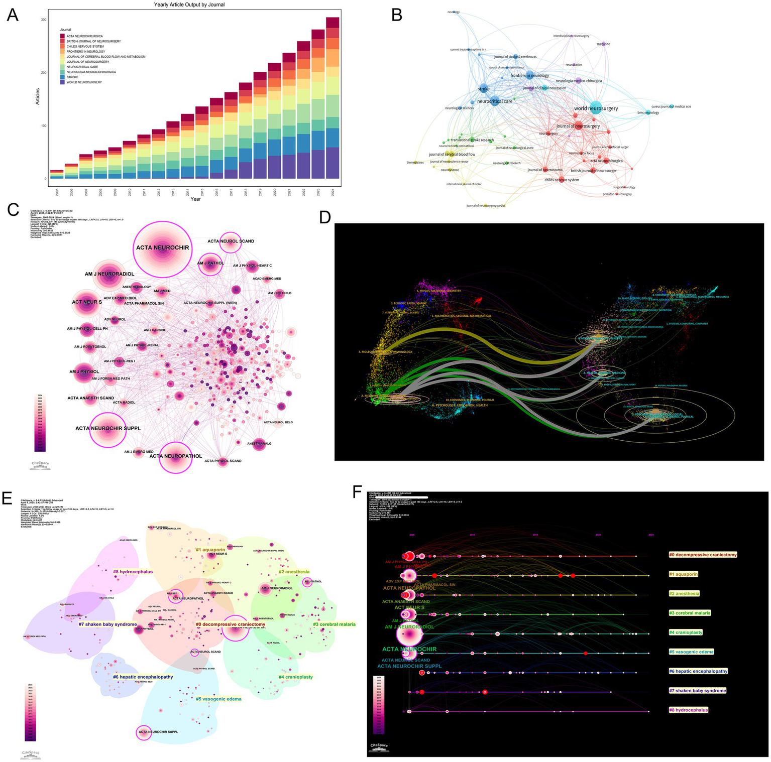 The dissemination of MCE research exhibited distinct structural dynamics across academic journals. The leading outlets include World Neurosurgery (59 publications), Neurocritical Care (42 publications), and Stroke (36 publications), accounting for 9.4% of total output (Figure 5A and Table 5). These journals predominantly published clinical studies bridging neurosurgical practice, neurocritical care protocols, and cerebrovascular pathophysiology, reflecting the field’s interdisciplinary foundations.