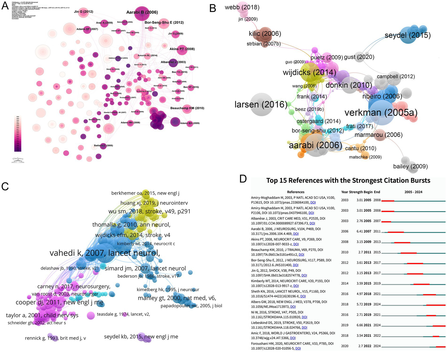 Modularity analysis identified three principal institutional clusters influencing MCE research (Figure 4E). The predominant cluster centers on Harvard-affiliated institutions, including Massachusetts General Hospital and Harvard Medical School. These collectively focused on advancing clinical interventions through surgical management optimization and neurocritical care protocol standardization. The second cluster, anchored by the University of California System with significant contributions from UCSF, demonstrated concentrated expertise in translational neuroscience, particularly in elucidating molecular pathways underlying edema formation and developing novel therapeutic agents. The third cluster, led by the University of Maryland network in collaboration with Pennsylvania Commonwealth institutions, focuses on neurocritical care operations research, highlighting population-level outcome studies and evidence-based guideline formulation. These thematic alignments suggest that institutional collaborations are strategically oriented toward complementary research priorities rather than geographical convenience, fostering disciplinary depth and cross-cluster knowledge transfer.