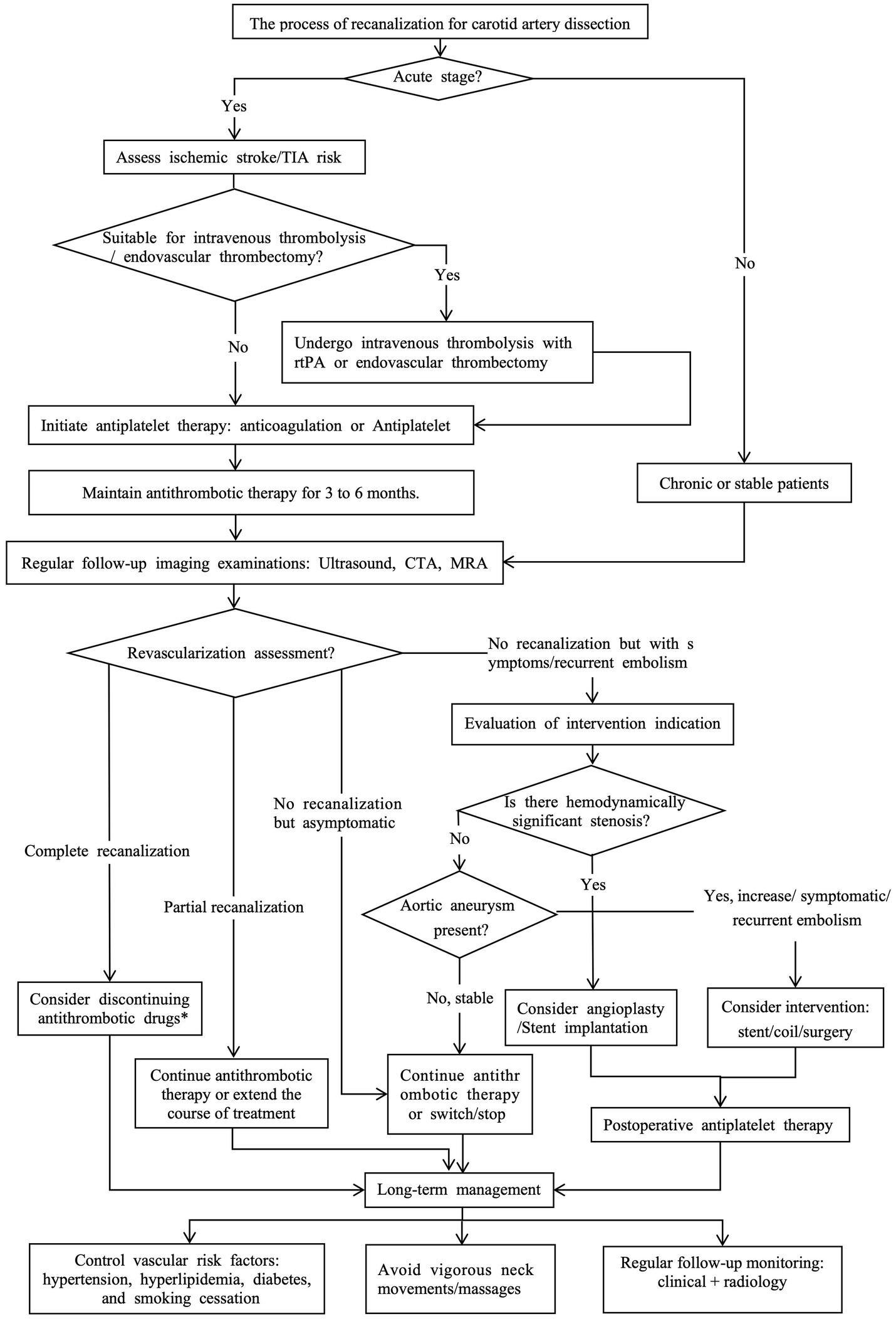 The optimal duration of antithrombotic therapy remains controversial and requires further exploration through more randomized controlled studies. A multicenter, observational, retrospective international study (STOP-CAD study) found that anticoagulation therapy did not have a significant advantage in reducing the risk of ischemic stroke, but it might be beneficial in patients with occlusive dissection. 87% of ischemic stroke events occurred within 1 month of dissection diagnosis. If anticoagulation therapy is chosen, switching to antiplatelet therapy within 180 days is reasonable (80). Pezzini et al. (81) compared the risk of ischemic stroke in patients who stopped and continued antithrombotic therapy. The results suggested that stopping antithrombotic therapy after 6 months did not increase the risk of cerebral ischemia during the follow-up period. Wadhwa et al. (49) demonstrated that long-term use of antiplatelet drugs (>6 months) or anticoagulation therapy did not affect recanalization status.