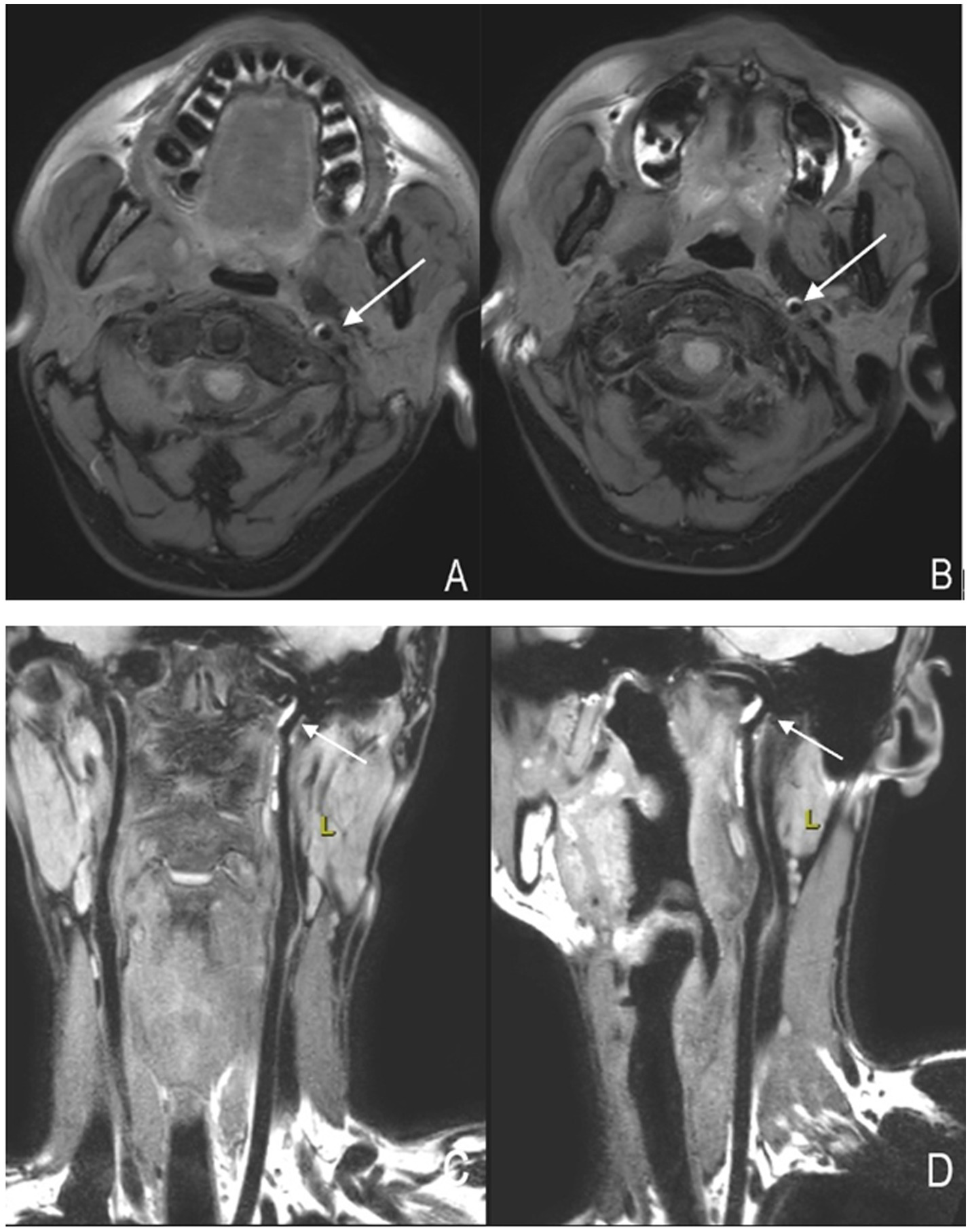 High-resolution magnetic resonance imaging showing arterial dissection-related vascular changes. (A,B) Axial images of the left internal carotid artery. The crescent-shaped high signal indicated by the arrow represents an "intramural hematoma." (C,D) Coronal and sagittal images of the left internal carotid artery, respectively. The high-signal structure indicated by the arrow represents an "intramural hematoma".