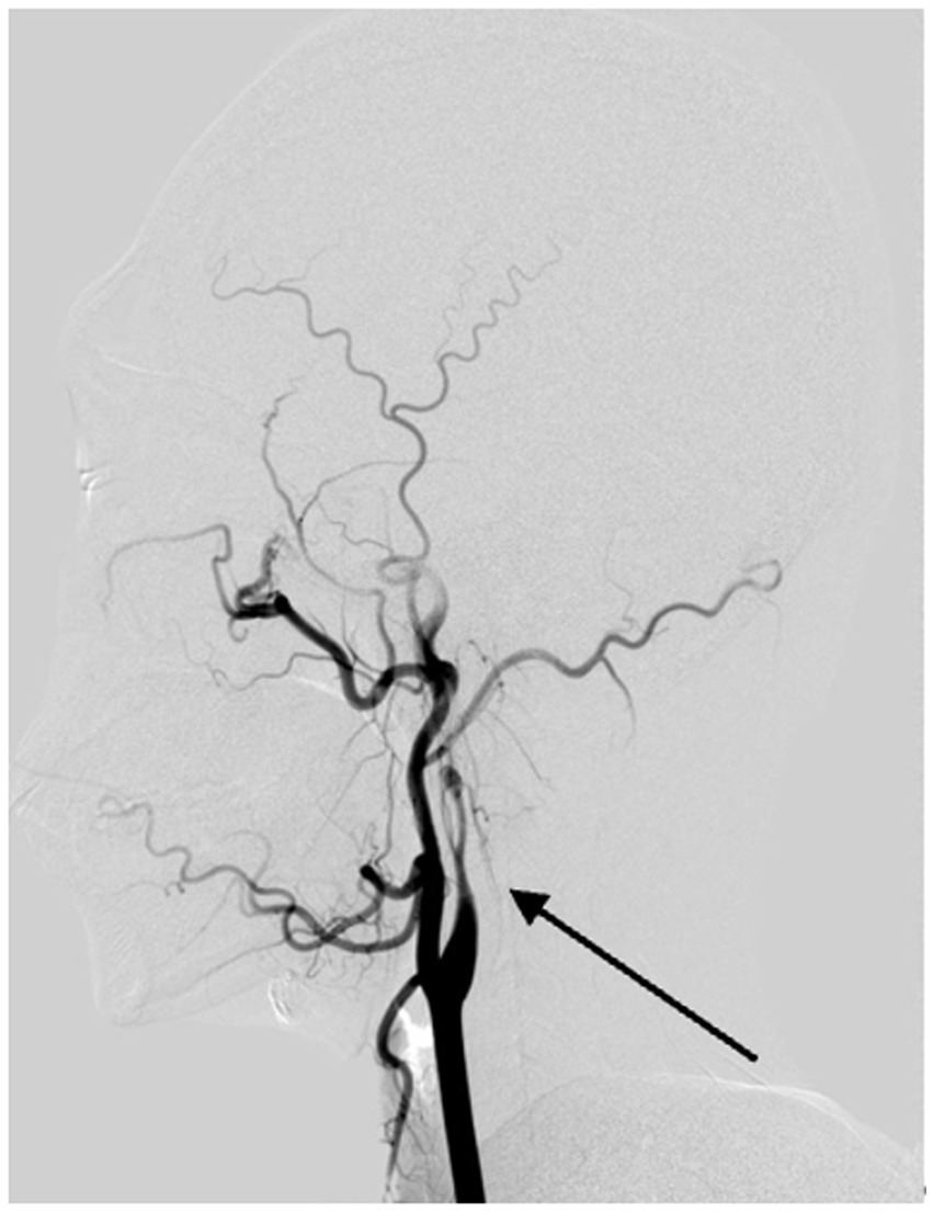 Figure 5. Digital subtraction angiography reveals vascular changes due to arterial dissection in the left internal carotid artery. The DSA image clearly demonstrates evidence of dissection in the left internal carotid artery, with the arrow pointing to a structure consistent with the 'flame sign,' characteristic of this condition.