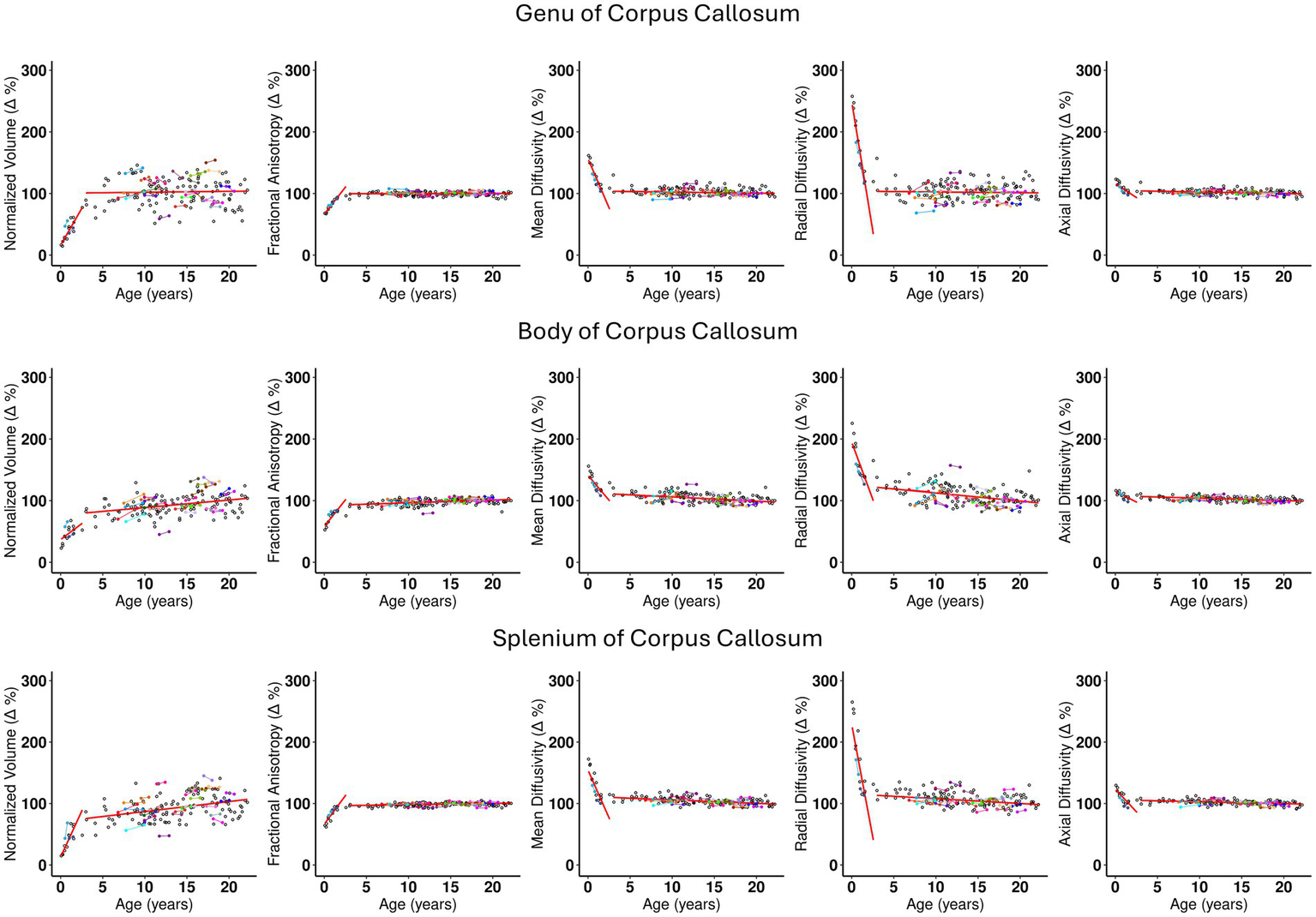 From visual observation, the percentage change in whole brain volume per subject, with respect to age, shows a nonlinear growth trajectory with a steep increase in volume in the initial years from birth, followed by a flattening of the trajectory (refer to Supplementary Figure S.4a). The ‘change-point’ in the trajectory of whole brain volume growth can be identified using two linear regressions (refer to section S.4 in the supplement). This approach allowed for a data driven approach of dividing the data into groups informed by the behavior of the growth trajectory of the whole brain volume across the age span of the study. Following this, ROI values, which were quantitively normalized from DTI metrics and for volume, were split into two groups; segment 1 before the ‘change-point’ (< 2.69 years) and segment 2 after the ‘change-point’ (> 2.69 years). Quantile regression was performed on each segment of the data, per ROI and metric. This regression step generated three parameters about the fitting performed in each segment from which we made some biological inferences. The parameters and their biological inferences are detailed below: