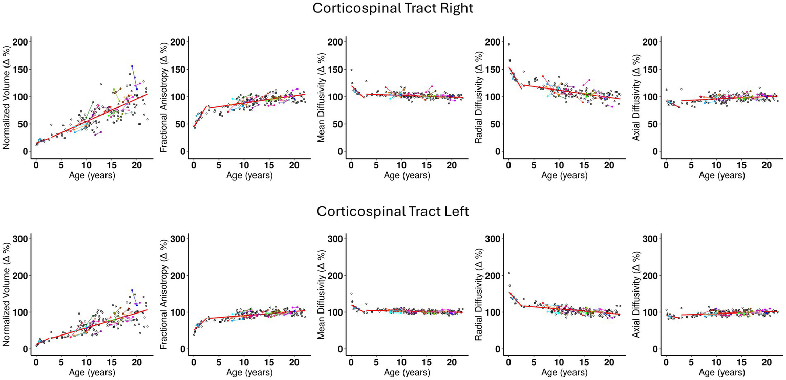 The results show that volumetric developmental trajectories varied largely among WM regions. The estimated volume at birth ranged: 12–53% of the adult value; where the rate of growth ranged: 3–30% of the adult value per year, in Segment 1; and 0–4% afterwards (Segment 2). The Corticospinal Tract, for example, showed protracted growth into young adulthood, while the Corpus Callosum growth was almost completed in the first 3 years. The magnitude of changes in local volume were generally larger than the magnitude of changes in diffusion metrics. Moreover, volumetric changes were more protracted, i.e., for many regions volume continued to increase even when diffusion metrics had reached a plateau.