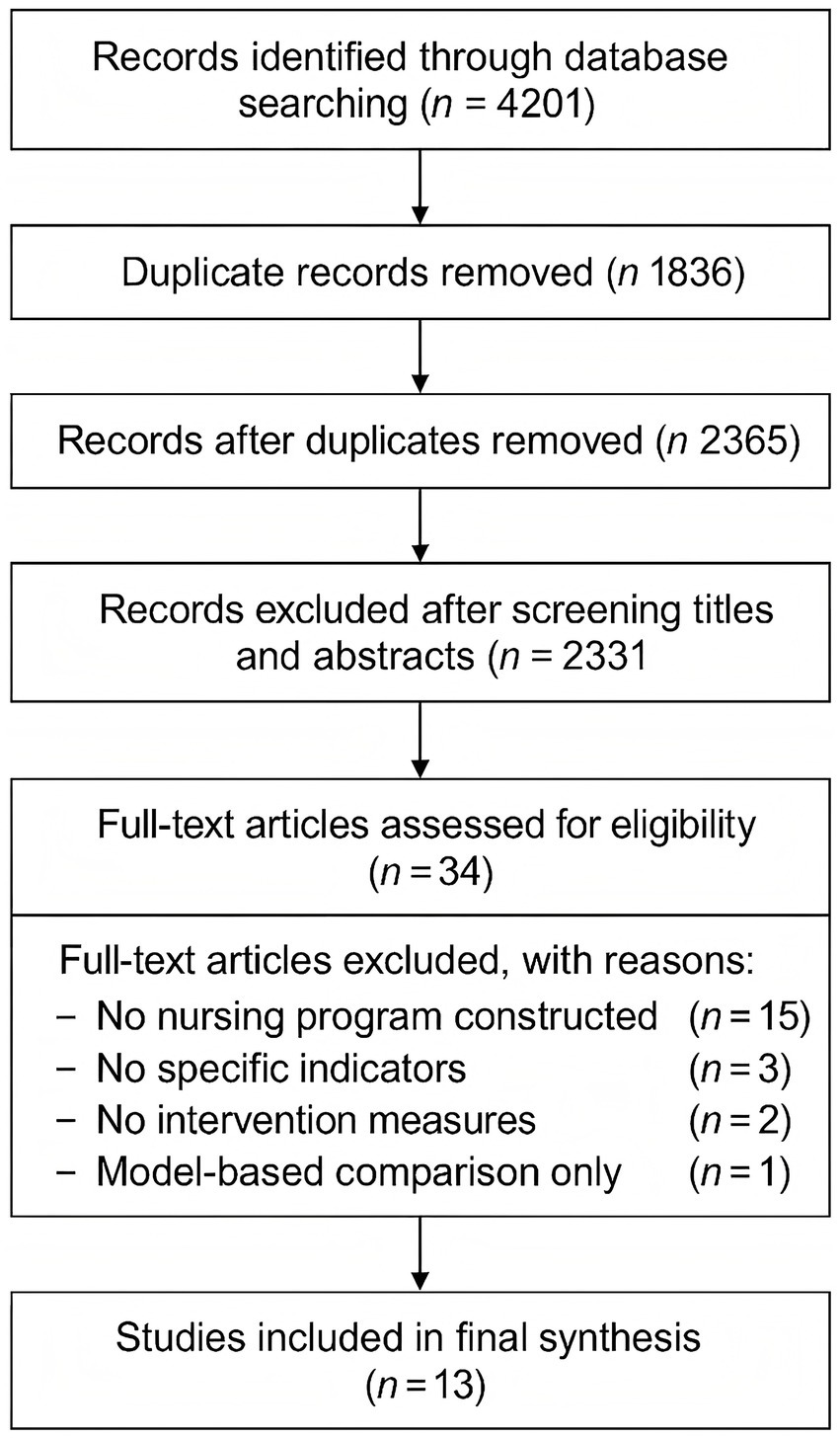 A total of 4,201 studies were initially identified. After removing duplicates, 2,365 articles remained. Following title and abstract screening and full-text review according to inclusion and exclusion criteria, 13 studies were included in the final analysis. These studies reported 23 predictive models for futile recanalization (10–22). The study selection process is illustrated in Figure 1.