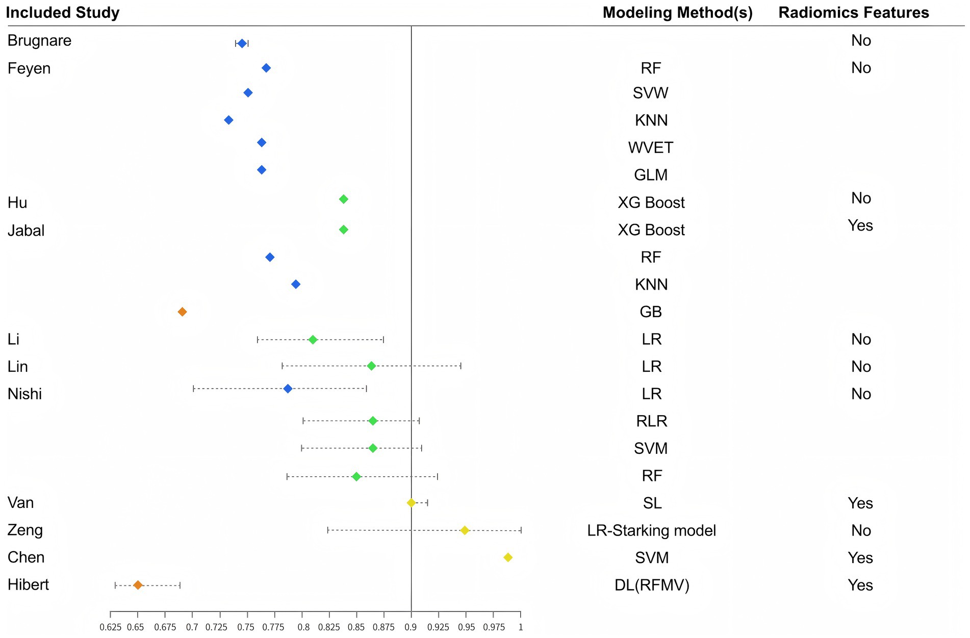 According to the “No Free Lunch” theorem proposed by Wolpert and Macready (37), no single algorithm universally outperforms others across all problems. Therefore, applying a range of modeling techniques and selecting the most appropriate approach based on data characteristics and clinical context is essential. Despite their potential, ML and DL models exhibit several important limitations. First, most were trained on relatively small datasets with limited external validation, raising concerns about overfitting and variable generalizability. Second, their interpretability remains limited: unlike regression-based models, which provide explicit coefficients for each predictor, ML models often function as “black boxes,” requiring advanced techniques such as SHAP or LIME to explain feature importance. Third, our stratified descriptive summary indicated that although the mean AUC of ML/DL models (0.81) was comparable to regression-based models (0.83), their performance was markedly more variable (0.65–0.98), suggesting unstable generalizability and the risk of overfitting in small or heterogeneous cohorts. A notable example is the Hilbert DL model, which achieved an AUC of only 0.65. This relatively poor performance may be explained by the small training sample size, as deep learning models typically require large amounts of data to extract robust feature representations. In addition, variability in imaging acquisition and preprocessing across centers may have further limited its generalizability. This case illustrates the vulnerability of ML/DL approaches to overfitting and performance instability when applied in data-limited or heterogeneous clinical settings.
