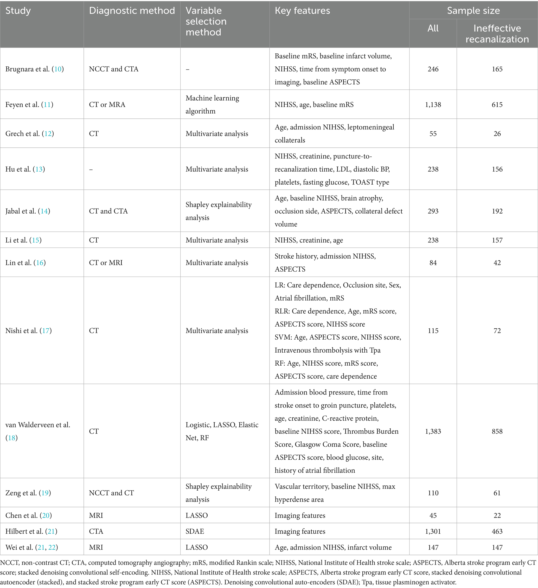 Age was incorporated into 16 out of 22 models. Older patients tend to have greater comorbidity burden and poorer functional reserve, which may compromise recovery even after successful recanalization (33). Although current guidelines do not impose age limits on endovascular therapy, outcomes in patients ≥80 years remain debated, making age a critical factor in shared decision-making.