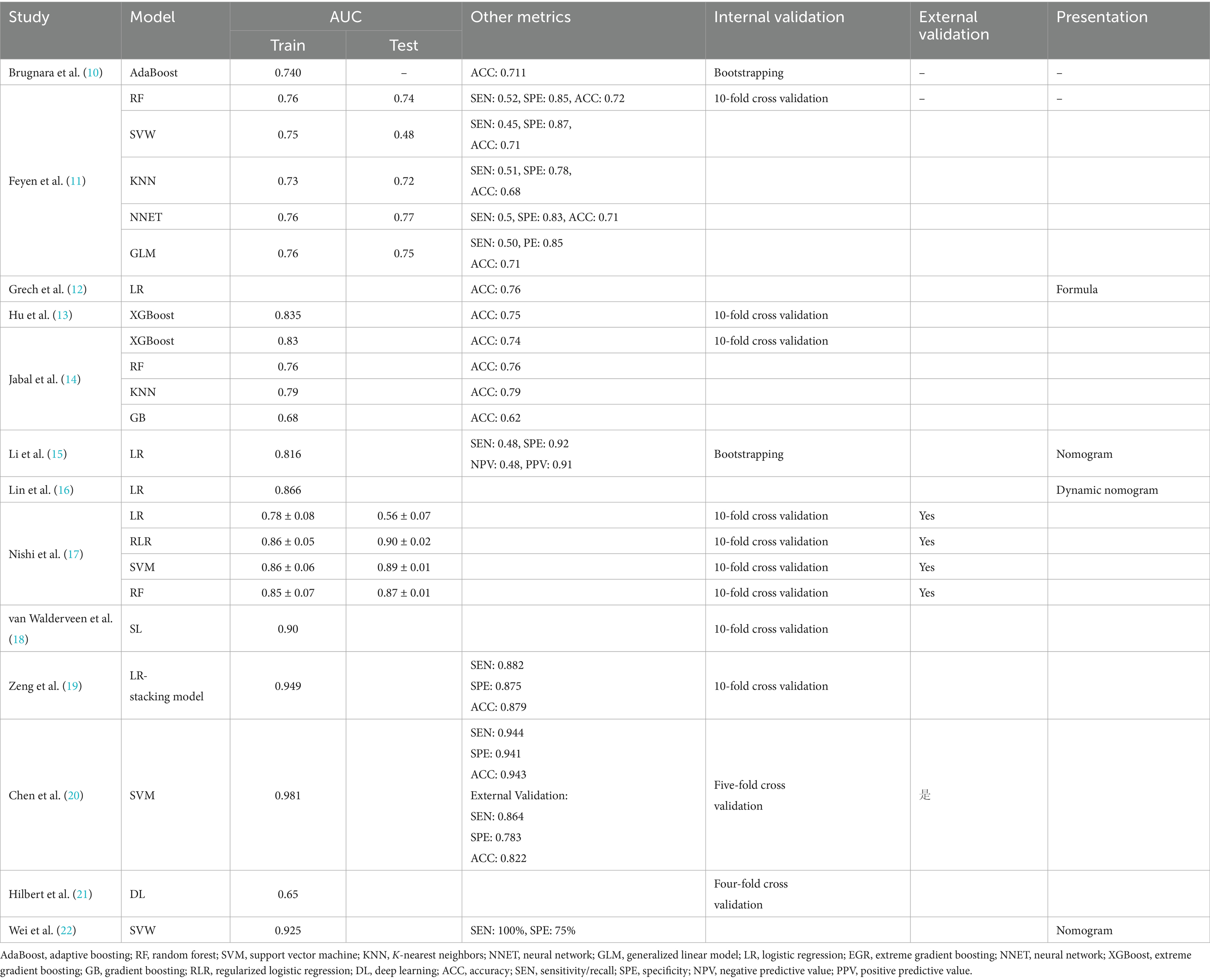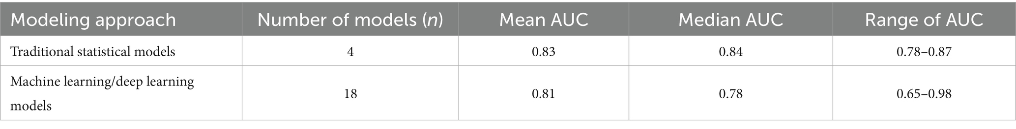 The sample sizes in the included studies ranged from 45 to 1,383 participants. The primary modeling approaches included logistic regression and machine learning algorithms (see Table 2). Six studies employed univariate analysis for variable selection (12, 13, 15–18, 21); three studies applied the least absolute shrinkage and selection operator (LASSO) (18, 19, 22); and five studies used machine learning-based selection methods (11, 14, 18, 19, 21). One study did not specify the method for variable selection (10). When stratified by modeling approach, regression-based models (n = 4) achieved consistent performance, with AUCs ranging from 0.78 to 0.87 (mean 0.83, median 0.84). In contrast, machine learning/deep learning models (n = 18) exhibited a wider distribution of performance (0.65–0.98), with a mean AUC of 0.81 and a median of 0.78 (Table 3).