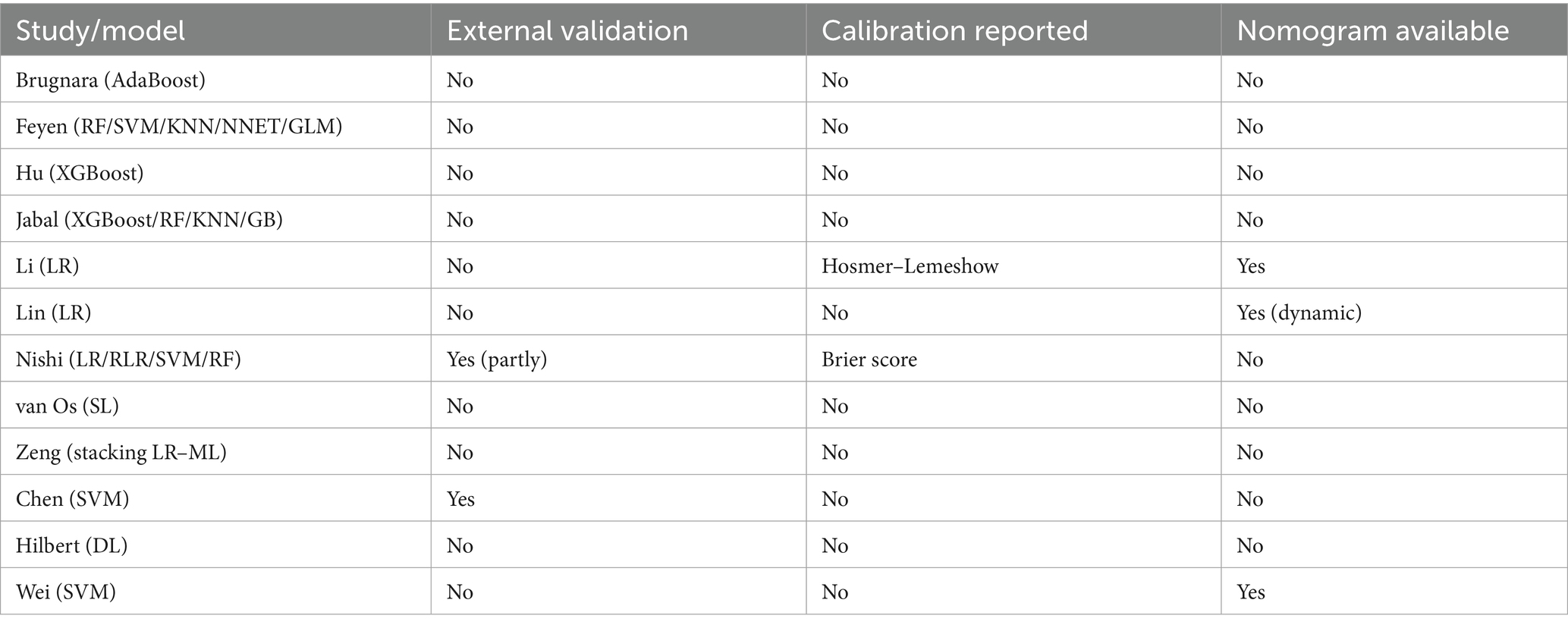 Moreover, many studies did not report AUC values or calibration metrics. Only two models reported calibration statistics. While the AUC reflects a model’s discriminative ability (28), calibration indicates the agreement between predicted probabilities and observed outcomes, which is equally critical for clinical applicability (29). According to the PROBAST assessment, all models were rated as high risk in the analysis domain. This reflects several methodological shortcomings: many studies did not achieve adequate sample sizes or events-per-variable ratios, increasing the likelihood of overfitting; variable selection was often based on univariate analysis alone, which may overlook relevant predictors; missing data were inadequately addressed; continuous variables were sometimes arbitrarily categorized; and calibration measures were rarely reported. Together, these issues explain the consistently high PROBAST risk ratings and highlight the need for stricter adherence to methodological guidelines in future studies. Future model development should adhere to PROBAST guidelines to minimize bias (9), and to TRIPOD reporting standards to ensure transparency and reproducibility (30).
