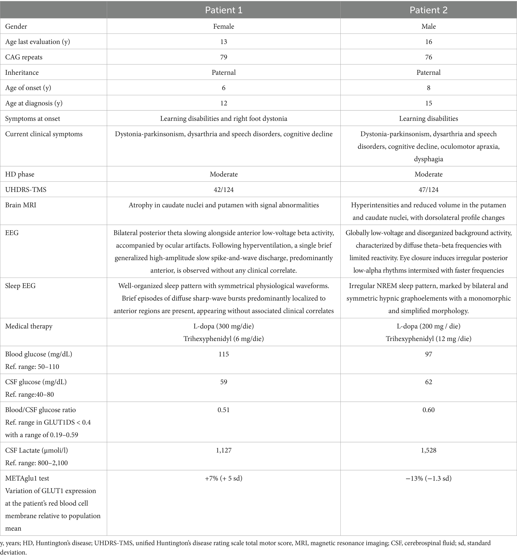 Both patients’ EEGs demonstrated diffuse background slowing, accompanied by epileptiform activity that increase during sleep, with no correlation observed between these findings and fasting status. These results align with existing literature, reflecting the electroclinical progression of pediatric Huntington’s disease (15). In contrast, GLUT1DS typically presents with generalized EEG slowing that becomes more pronounced during fasting (16). Additionally, in some cases, fasting EEG reveals diffuse spike–wave discharges that markedly improve following food intake (17), indicating a direct impact of metabolic dysfunction on cerebral electrical activity.