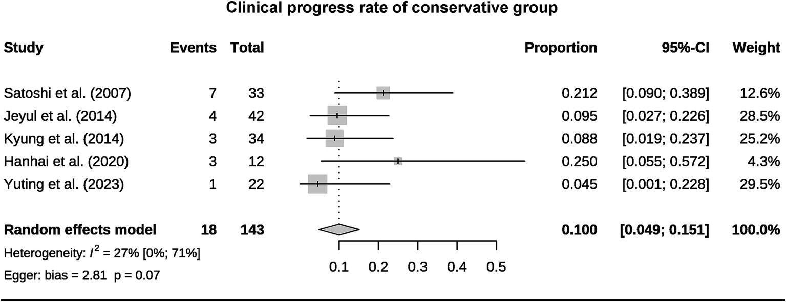 A total of seven AMMD studies were included in a meta-analysis, involving 393 patients and 649 hemispheres. Three HSMMD studies were all from the same institution. The pooled rate for clinical progression, hemorrhagic stroke, ischemic stroke, transient ischemic attack (TIA), and radiological progress of conservative group was 10% (95% CI 4.9–15.1%), 3.8% (95% CI 0.4–7.2%), 0.7% (95% CI 0–2.3%), 3.6% (95% CI 0.6–6.6%), and 15.6% (95% CI 10.2–22.1%), respectively. The pooled rate for stroke, TIA, and radiological progress of the surgical group was 3.7% (95% CI 0–10.8%), 0.2% (95% CI 0–3.0%), and 4.8% (95% CI 0–10.5%), respectively. Revascularization did not show a protective effect on TIA and radiological progression for AMMD.