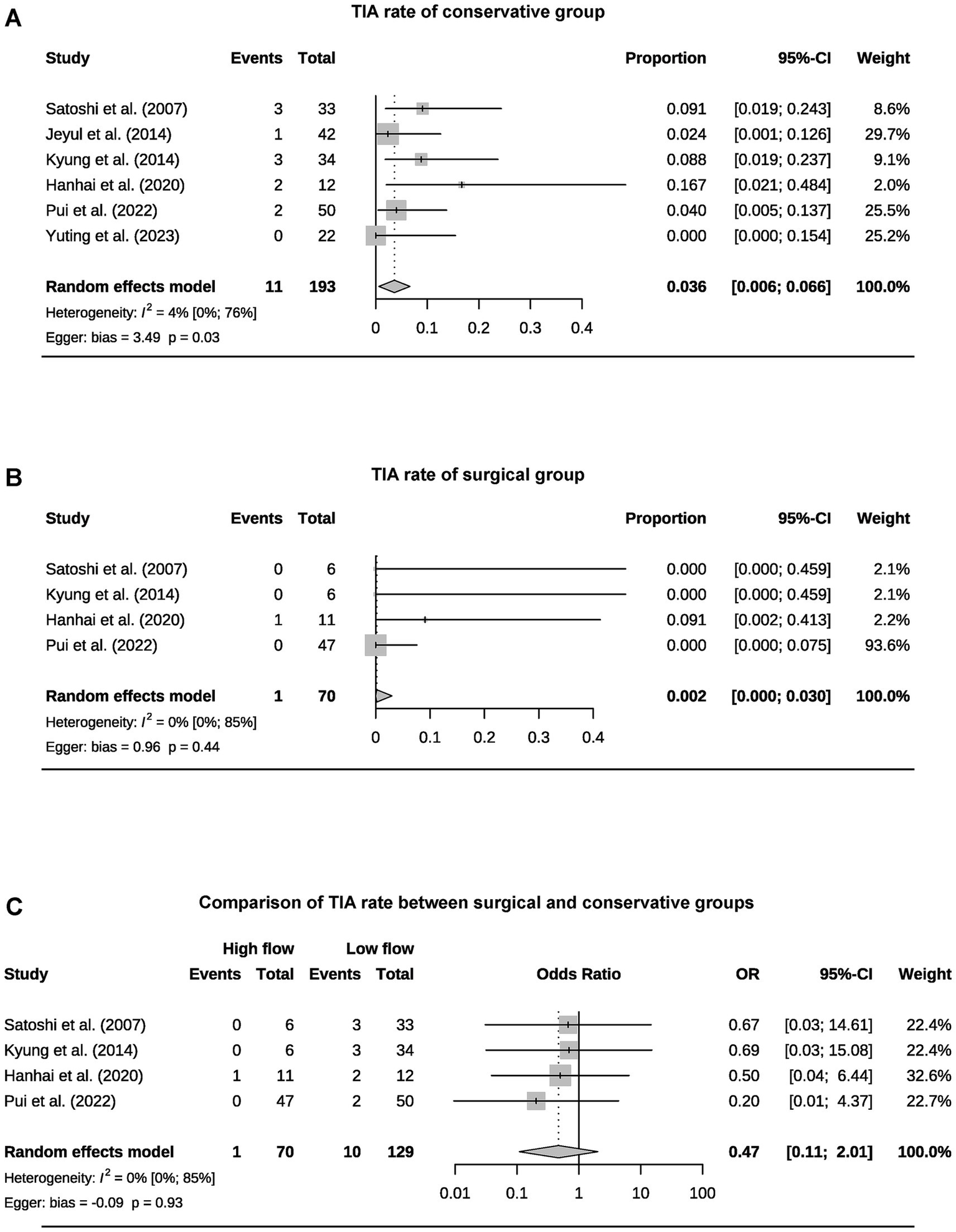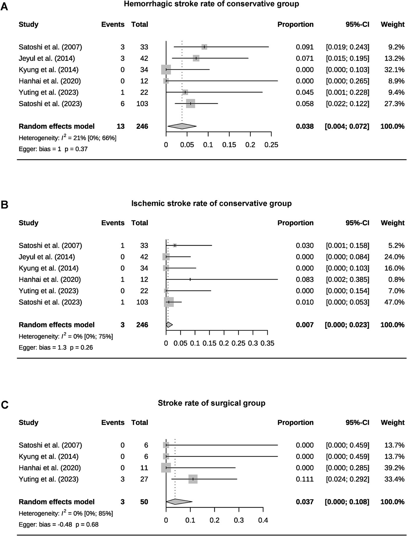 Using R and R package “meta” for analysis. Calculate the pooled effect sizes and 95% confidence intervals (CIs) for outcomes. All analyses were performed using a random effect model. Heterogeneity was detected with the I2 and 95% CI. Using Egger’s test to evaluate publication bias for pooling ≥5 studies. Data expressed as mean ± standard deviation, mean (range), or number of events (percentage). Other data formats will be marked.