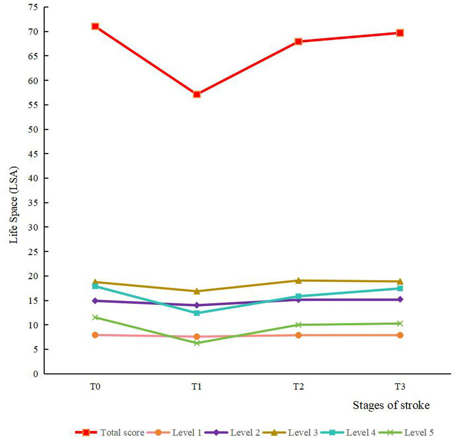 The trends of scores for life space and various levels. Level 1, outside bedroom; level 2, outside home; level 3, to neighborhood; level 4, to town; level 5, beyond town.