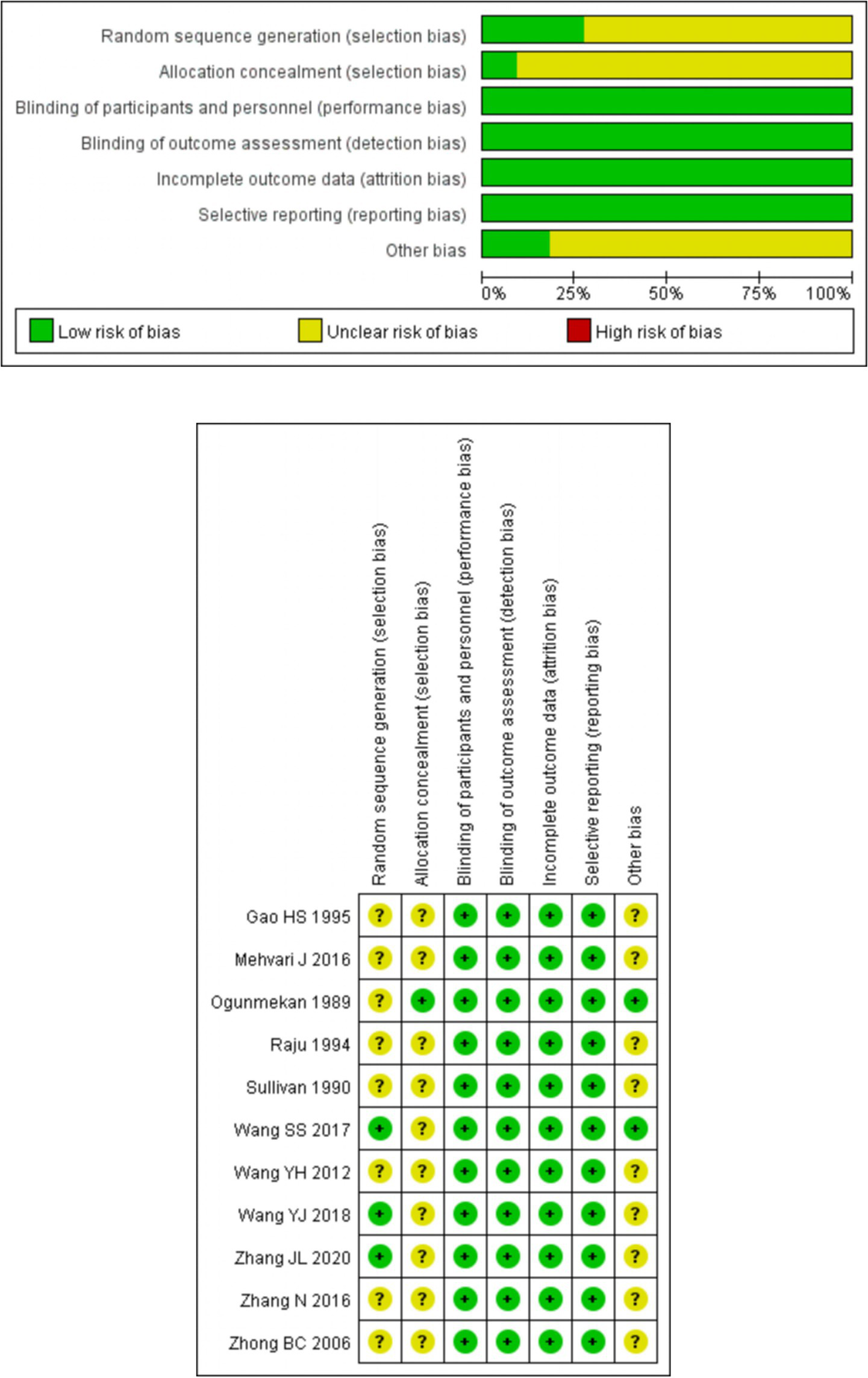 Risk of bias assessment for the included studies was carried out by two evaluators. The assessment adhered to the guidelines set out in the Cochrane risk of bias assessment tool (18). Multiple key domains were evaluated, including random sequence generation, allocation concealment, blinding procedures, integrity of outcome data, selective reporting, and other potential sources of bias. Based on the pre-defined scoring criteria, each study was classified as having a low, unclear, or high risk of bias. In cases where discrepancies arose during the evaluation, a third evaluator was consulted. The final risk level of each study was determined following this consultative process.
