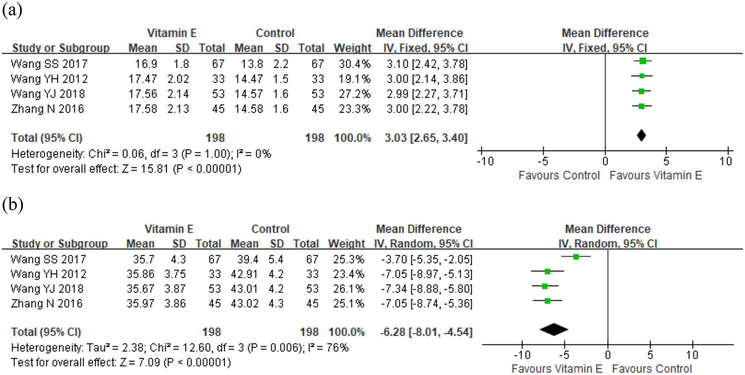 Four studies involving 396 patients reported plasma levels of T-Aoc and MDA to assess antioxidant capacity (21–23, 25). Meta-analysis revealed significant differences in T-Aoc (WMD = 3.03, 95% CI (2.65, 3.40), p < 0.01. I2 = 0%, heterogeneity p = 1.00) and MDA (WMD = −6.28, 95% CI (−8.01, −4.54), p < 0.01; I2 = 76%, heterogeneity p = 0.006) between the vitamin E and control groups (Figure 5). One study revealed that the mean increase in T-Aoc, catalase, and glutathione was significantly higher in the vitamin E group than in the control group (p < 0.05), while there was no significant difference in MDA between the two groups (14). These results indicated that vitamin E had stronger antioxidant capacity than the control group. The observed heterogeneity among the studies might be attributed to different detection methods: two studies used ferrous iron reduction (21, 23), while the other two employed colorimetry (22, 25).