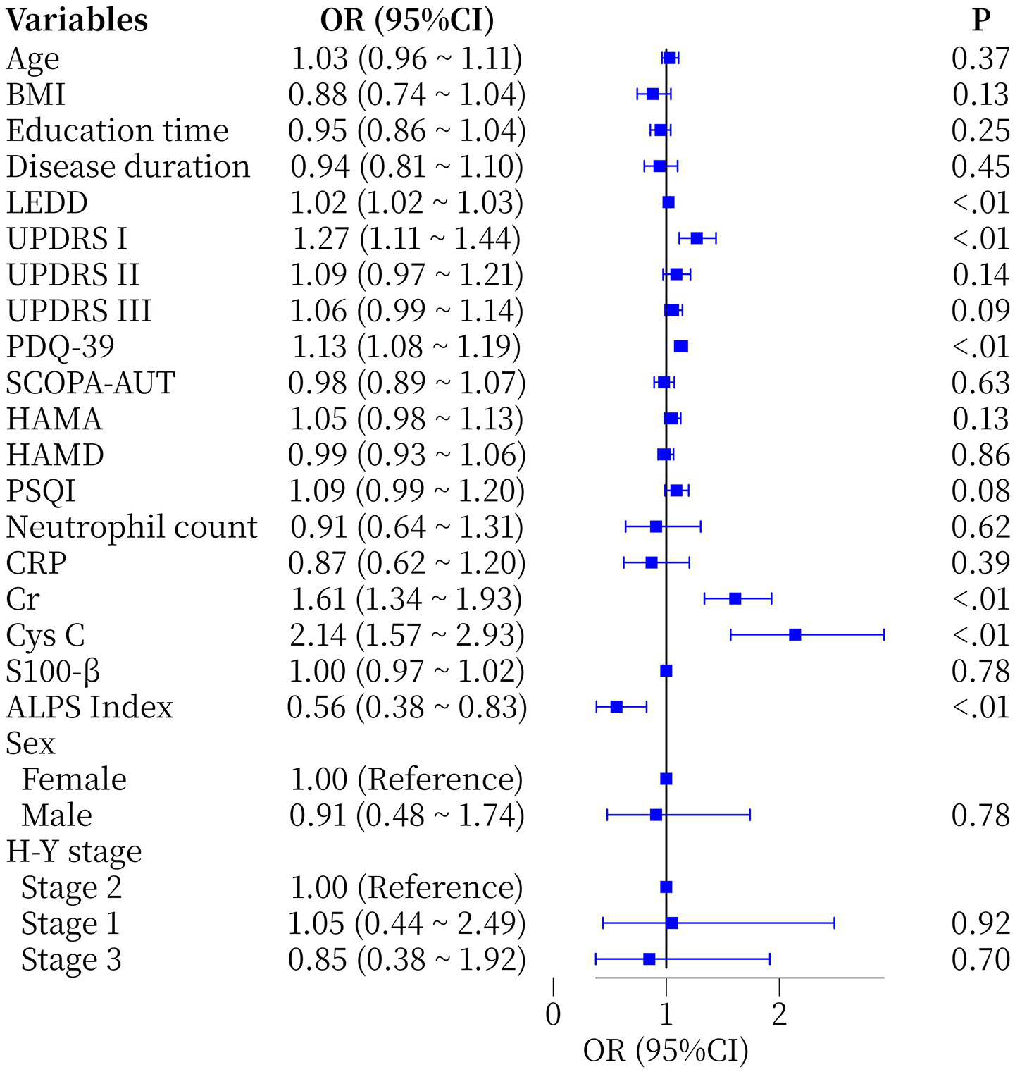 One-way logistic regression showed that the Cr (OR = 1.61, 95%CI 1.34–1.93, p < 0.01) and ALPS index (OR = 0.56, 95%CI 0.38–0.83, p < 0.01) were statistically significant (Figure 2). Furthermore, whether PD patients had comorbid MCI or not was used as a dependent variable (1 = yes, 0 = no) and variables with p < 0.05 in univariate analysis (LEDD, PDQ-39, UPDRS I, Cr, Cys C and ALPS index were included). A multivariate model was constructed using backward stepwise regression, which showed that LEDD (OR = 1.01, 95%CI 1.00–1.03, p = 0.005) and Cr (OR = 1.34, 95%CI 1.10–1.66, p = 0.005) retained their independent predictive value. Notably, although PDQ-39, Cys C and ALPS index were significant in the univariate model, they did not show independent associations in the multivariate model (Table 2), suggesting that their effects may be influenced by confounders or attenuated by the limited sample size.