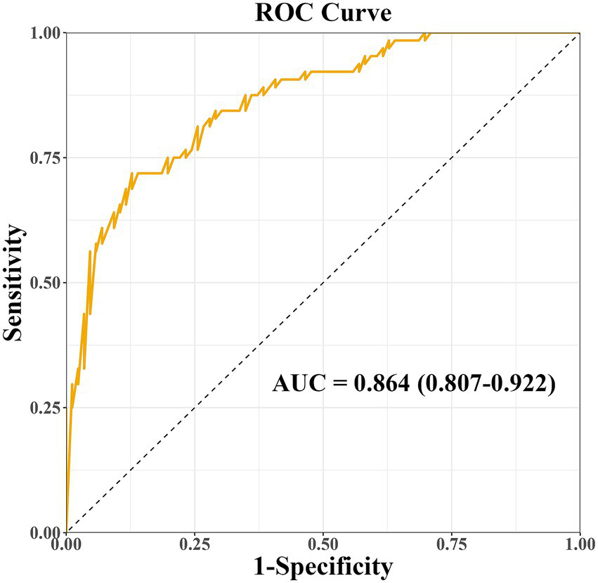 Presently, the diagnosis of PD-MCI is undergoing a shift toward multimodal assessment, integrating a range of methodologies including single photon emission computed tomography imaging of dopamine transporters, the detection of α-syn and AD markers in cerebrospinal fluid, as well as neurophysiological and genetic analysis (8). Nevertheless, there are still many challenges in reality: the prevalence of advanced magnetic resonance imaging (MRI) sequence examinations is relatively low, the risk of invasive operation in cerebrospinal fluid collection, and the high cost of the examination also limit its wide application. Consequently, subjective assessment tools such as Montreal Cognitive Assessment (MoCA) scale remain the prevailing standard in clinical practice. In this context, there is an urgent need to construct a multidimensional prediction model based on routine examination tools to achieve early identification of PD-MCI, facilitate intervention and improve prognosis. The model constructed in previous studies (9), combining neuron-specific enolase and nigrostriatal hyperchromicity, demonstrated high accuracy in predicting CI associated with PD (AUC = 0.823, 95% CI 0.781–0.864, p < 0.001). This study also suggests that integrating clinical indicators with neuroimaging biomarkers can help improve the identification of CI in patients with PD.