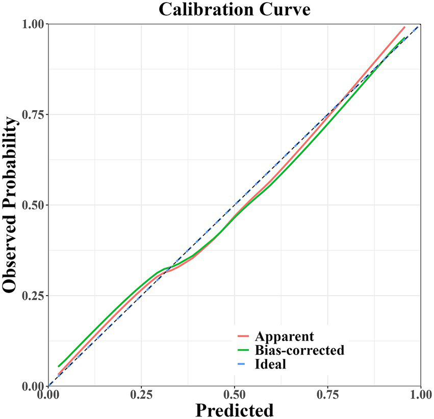 Normally distributed measures were expressed as mean (standard deviation) [Mean (SD)] and t-test was used to compare between groups; non-normally distributed data were expressed as median (interquartile range) [Median (IQR)] and Mann–Whitney U-test was used; and the categorical variables (Sex, H-Y stage) were described as frequency (percentage) [n (%)] and Chi-square test was used. Variables that were statistically significant (p < 0.05) in the univariate analysis were included in the multifactorial logistic regression analysis to screen for independent risk factors for PD-MCI. Based on the results of the multifactorial logistic regression analysis, a column-line graph prediction model was constructed using the rms program package in the R language to quantify the risk factor weights. Model discrimination was assessed by receiver operating characteristic (ROC) curve, and internal validation was performed by bootstrap 1,000 resampling, and model calibration and clinical net benefit were analyzed by calibration curve and decision curve, respectively. The significance level was set at α = 0.05 (two-tailed test).