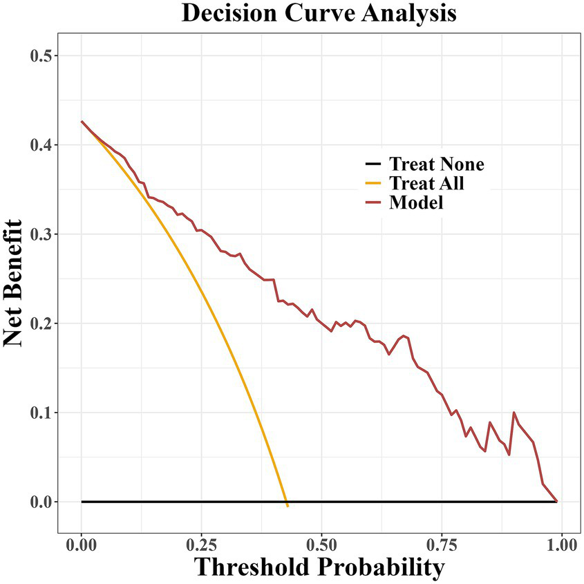 Many clinical trials are currently underway to explore potential disease-modifying therapeutic strategies for PD, in the hope of halting or significantly slowing the neurodegenerative process (18). However, most studies on PD-MCI focus on the correlational analysis of influencing factors, and the practical applications for disease prevention and early detection are still limited. Additionally, there is a lack of studies assessing the risk of PD-MCI through the construction of clinical prediction models. In conclusion, this study integrates routine multidimensional data, including clinical assessments, hematological tests, and imaging indices, to construct a clinical model for predicting PD-MCI risk. This model aids in early identification of high-risk individuals and provides a foundation for early screening and delayed cognitive decline.