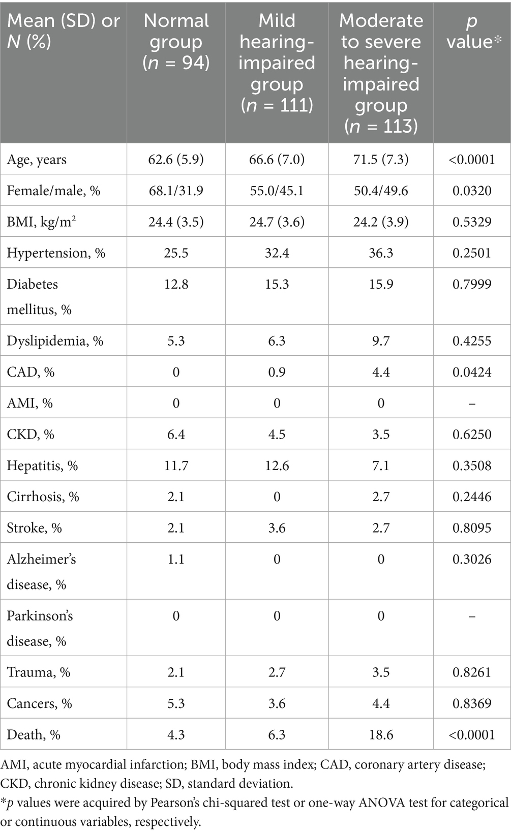 Averaged pure tone threshold of all tested six frequencies (250 Hz, 500 Hz, 1,000 Hz, 2000 Hz, 4,000 Hz and 800 Hz) of both ears was divided into three cohorts: normal hearing group [0–24 decibel hearing level (dBHL)]; mild hearing-impaired group (25–39 dBHL); moderate and severe hearing-impaired group (40–89 dBHL) (15). In addition, age, gender, body mass index (BMI), hypertension, diabetes mellitus (DM), dysplipidemia, coronary artery disease (CAD), acute myocardial infarction (AMI), chronic kidney disease (CKD), hepatitis, cirrhosis, Parkinson’s disease, Alzheimer’s disease, stroke, cancers, and trauma were recorded and will be adjusted during statistical analysis.