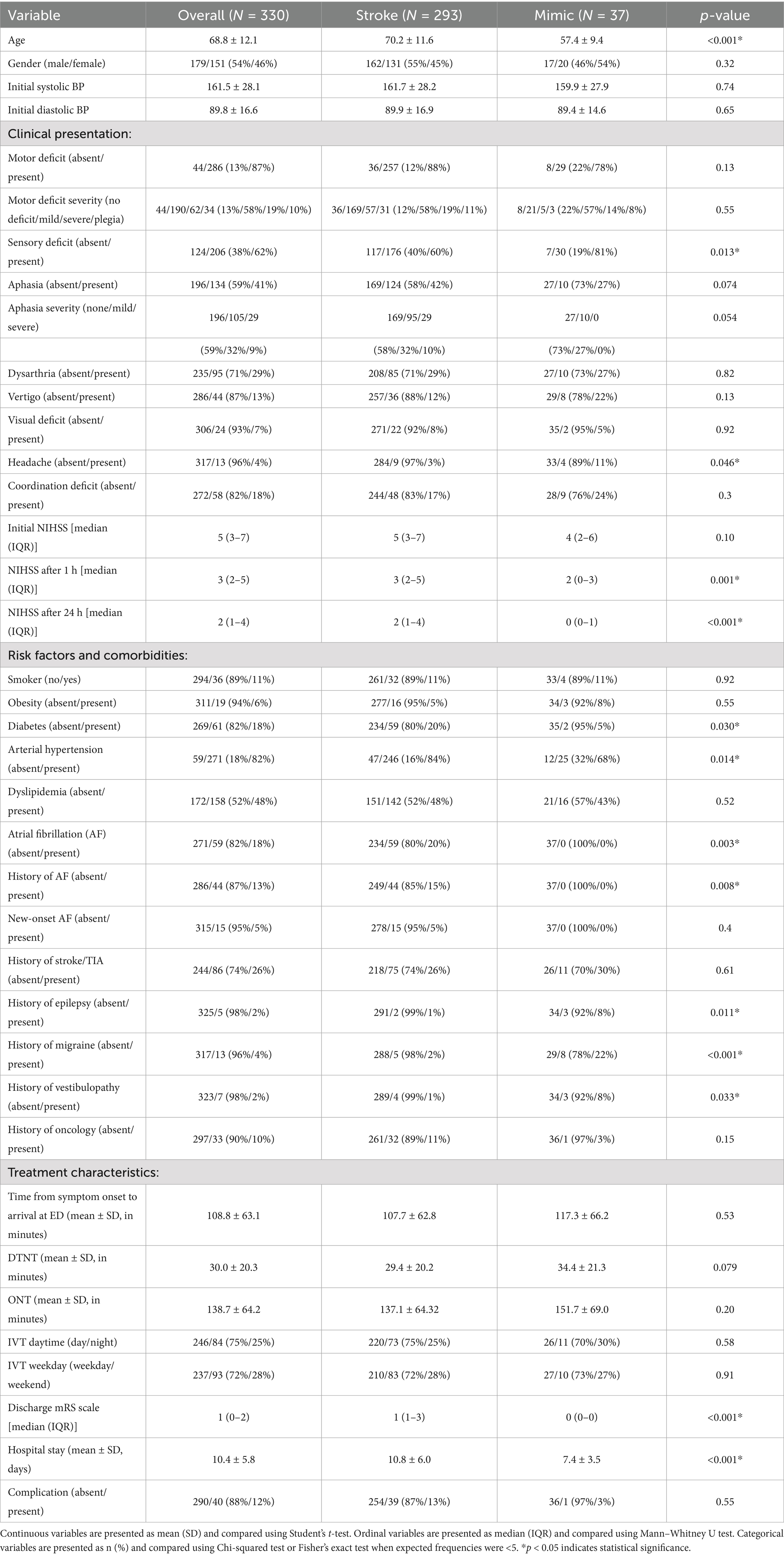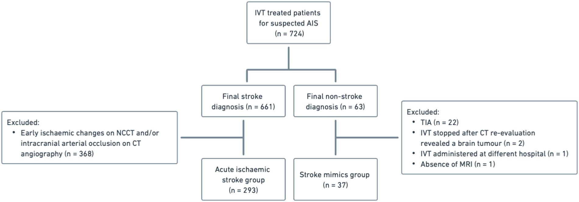 A total of 724 patients underwent IVT for suspected AIS between January 1, 2022, and December 31, 2024. Based on predefined inclusion and exclusion criteria, 330 patients were included in the final analysis, of whom 293 (88.8%) were confirmed to have acute ischemic stroke, while 37 (11.2%) were ultimately identified as stroke mimics. Figure 1 presents a detailed overview of the patient selection and enrollment process.