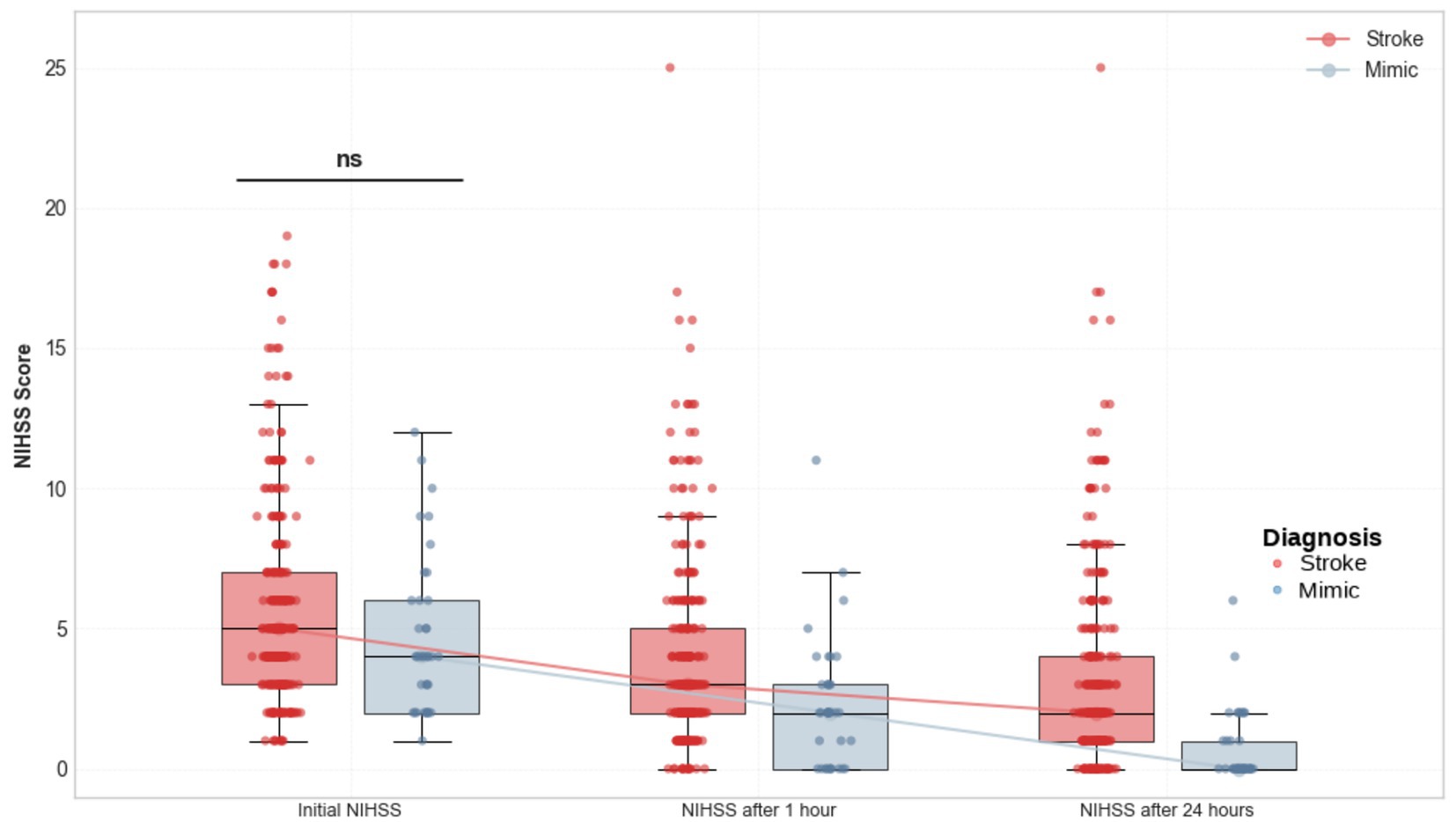 The initial NIHSS scores were comparable between SM and AIS [median (IQR) for mimics 4 (2–6) vs. 5 (3–7), p = 0.10]. However, NIHSS scores at 1 and 24 h post-thrombolysis were significantly lower in the mimic group (2 [0–3] vs. 3 [2–5] at 1 h, p = 0.001 and 0 [0–1] vs. 2 [1–4] at 24 h, p < 0.001). Figure 2 illustrates pairwise and groupwise comparisons of NIHSS scores between the mimic and stroke groups at presentation, 1 and 24 h after the IVT.