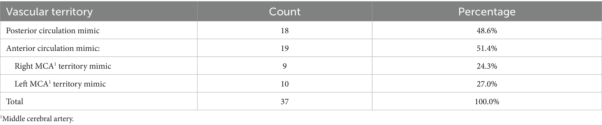 Among the 37 patients classified as stroke mimics, 18 cases (48.6%) simulated posterior circulation strokes, while 19 cases (51.4%) mimicked anterior circulation strokes. Table 2 presents the distribution of stroke mimics according to the vascular territory they clinically resembled.