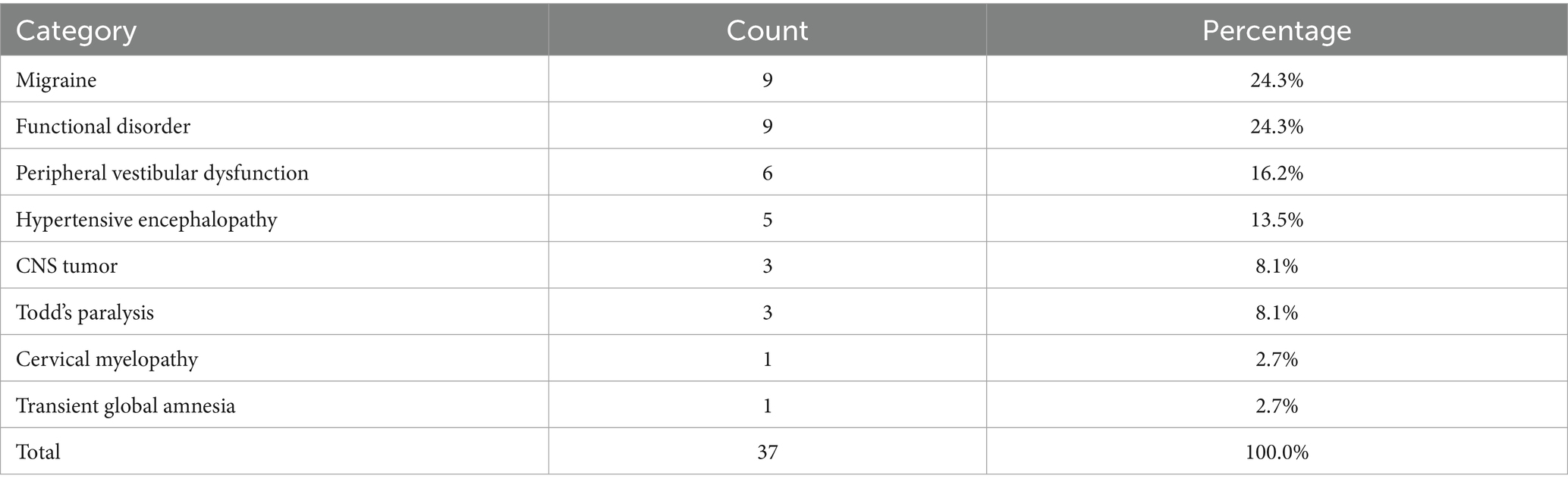 Among the 37 patients with SM, the most common etiologies were migraine (24.3%) and functional disorders (24.3%), followed by peripheral vestibular dysfunction (16.2%), hypertensive encephalopathy (13.5%), central nervous system (CNS) tumors (8.1%), Todd’s paralysis (8.1%), cervical myelopathy (2.7%), and transient global amnesia (2.7%). Results are summarized in Table 3.