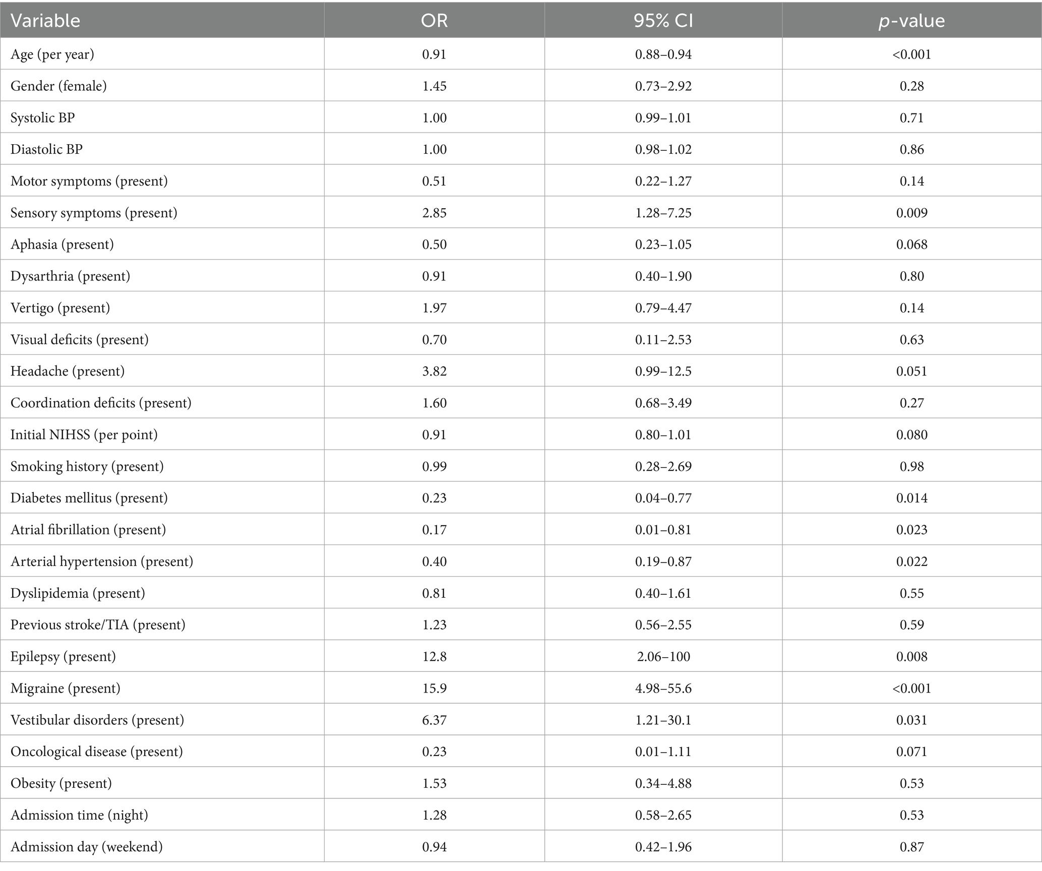 Table 4. Univariate logistic regression analysis results, indicating demographic, clinical and treatment-related factors associated with stroke mimics.