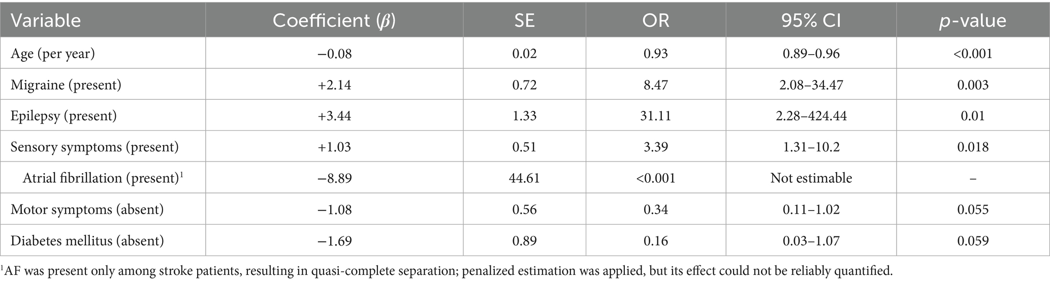 LASSO logistic regression identified 10 candidate predictors with non-zero coefficients: age, gender, motor symptoms, sensory symptoms, headache, history AF, diabetes mellitus, epilepsy, migraine, and vestibular disorders. These variables were subsequently entered into a Firth’s bias-reduced logistic regression model to obtain adjusted odds ratios.