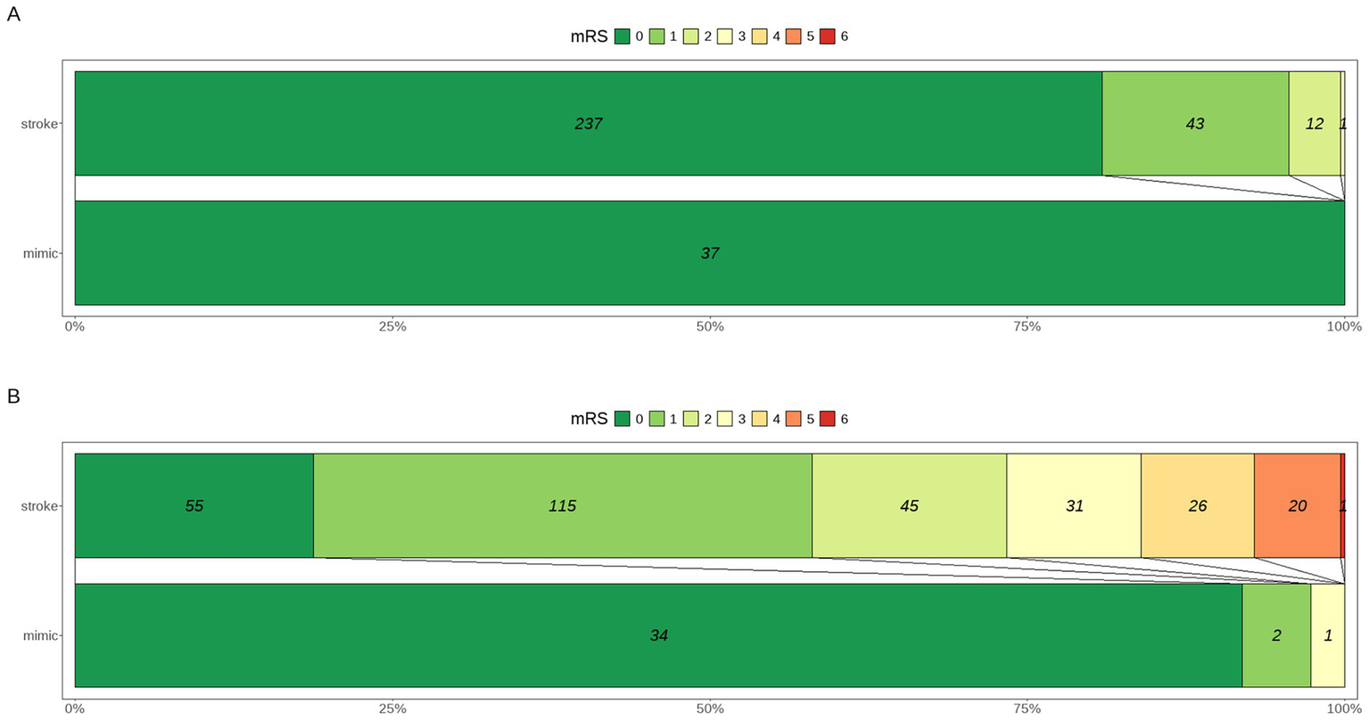 All patients in the mimic group had a baseline mRS score of 0, compared to 81% in the stroke group (p = 0.013). At discharge, functional outcomes were significantly better in the mimic group, with 92% having an mRS of 0 compared to only 19% in the stroke group (p < 0.001). The median mRS at discharge was 0 in the mimic group versus 1 in the stroke group (p < 0.001). Results are visualized in Figure 3.