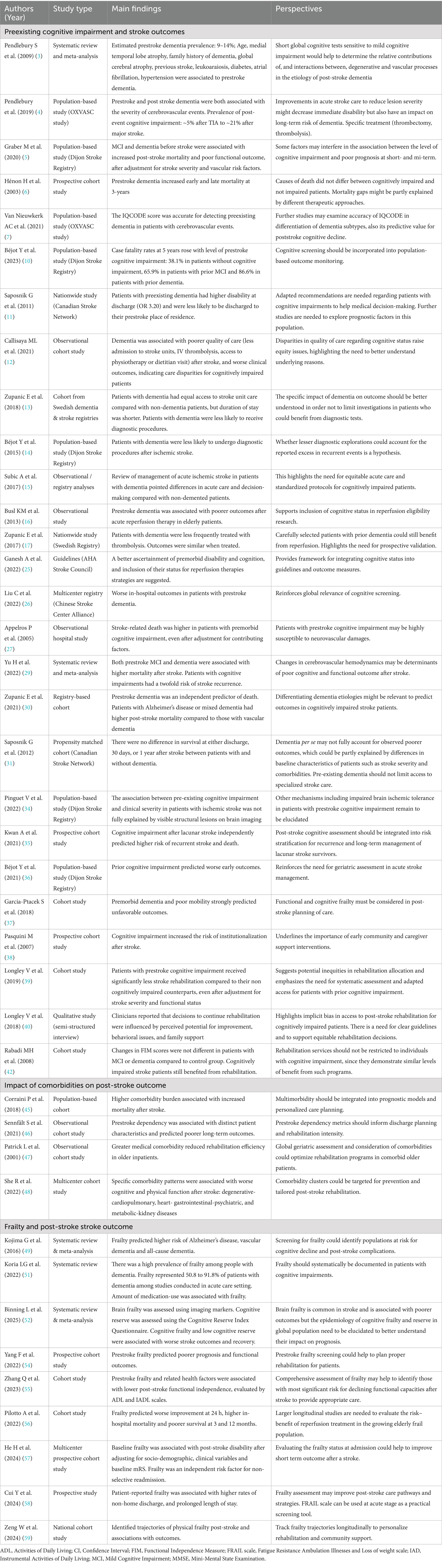 Table 1. Summary table of selected relevant studies on prestroke cognitive impairment, frailty, and post-stroke outcomes, and research perspectives.